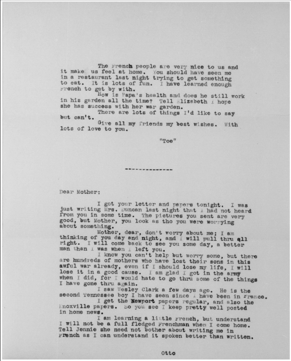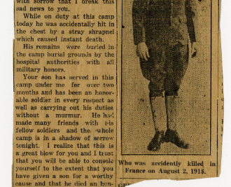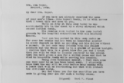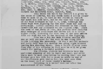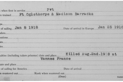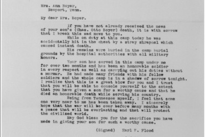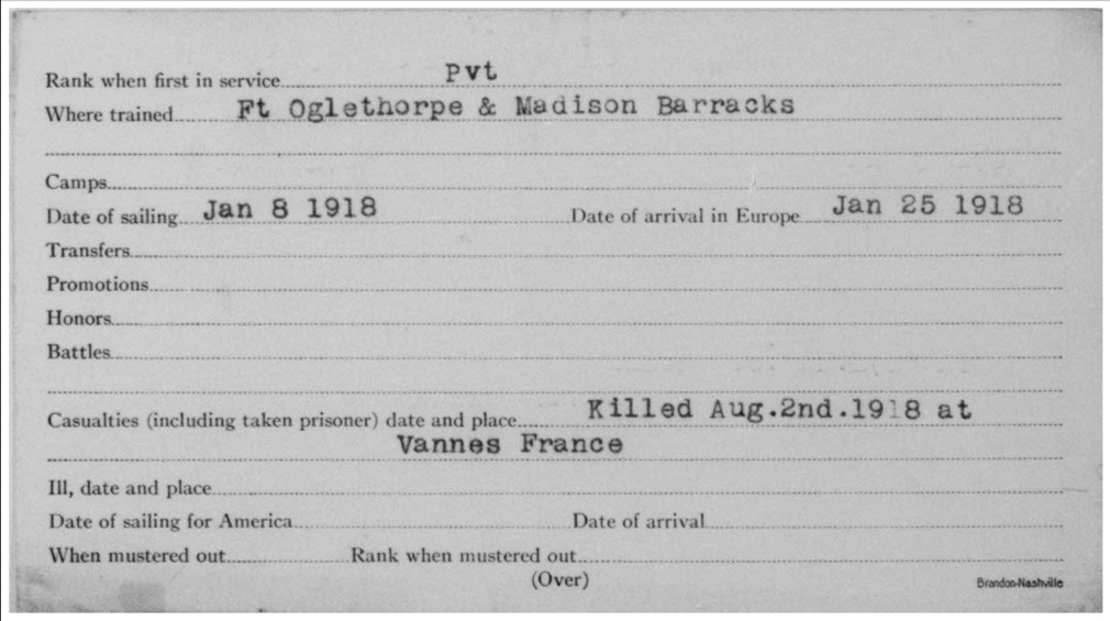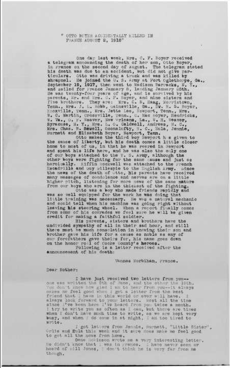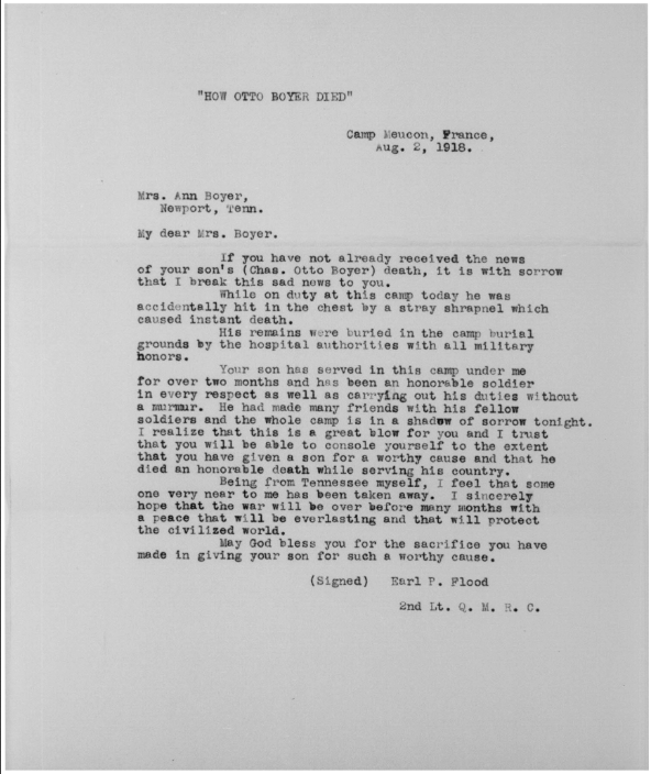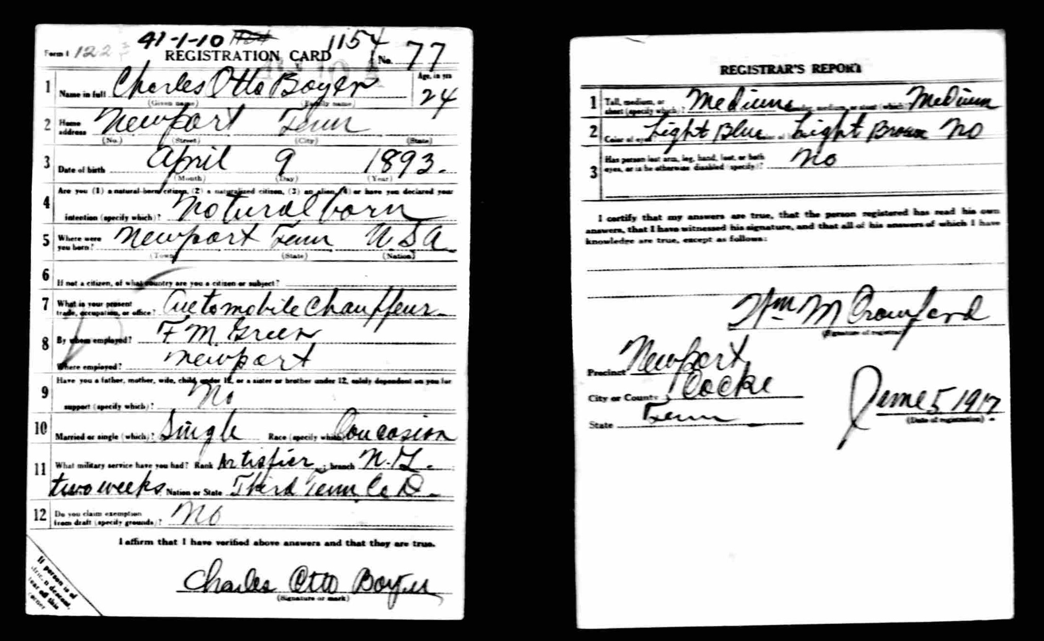 Charles Otto Boyer was born 9 April 1893, Newport, Tennessee to Creed Fulton and Anne Boyer. He entered the service on 21 September 1917 at Ford Oglethorpe in Atlanta, Georgia and received further training at Madison Barracks. He sailed to Europe on 8 January 1918, arriving on 25 January. He was driving a truck killed by shrapnel at Vannes in France on 2 August 1918. He is buried plot A row 25 grave 20, Oise-Aisne American Cemetery, Fère-en-Tardenois, France.