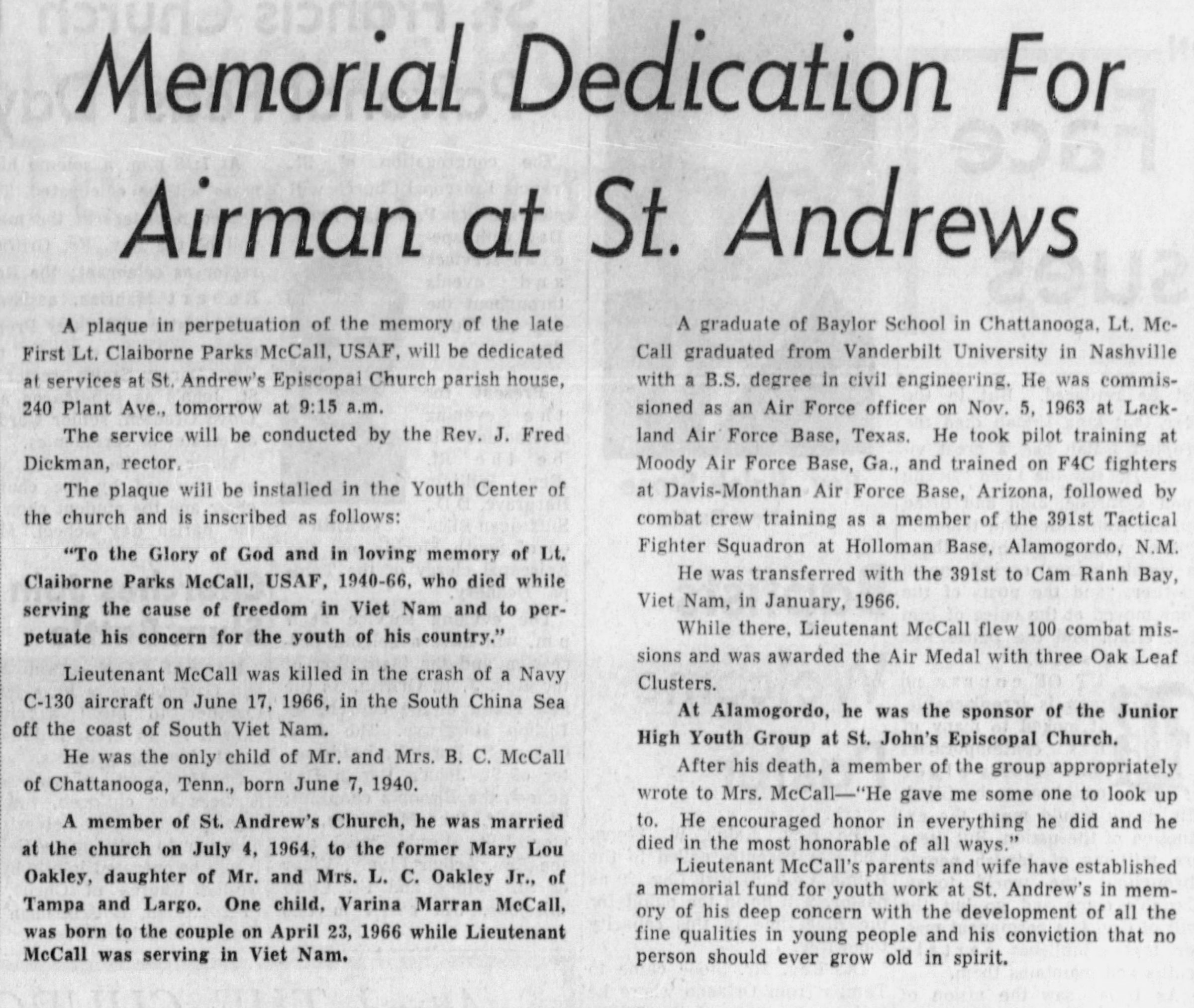 On 17 June 1966, First Lieutenant Claiborne Parks McCall was serving with the 391st Tactical Fighter Squadron, 12th Tactical Air Fighter Wing, 7th Air Force, in South Vietnam.