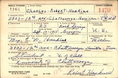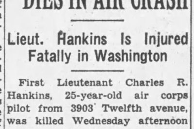 First Lieutenant Charles R. Hankins, 25-year-old air corps pilot from 3903 Twenfth avenue, was killed Wednesday afternoon in the crash of his plane near Port Angeles, Wash., his parents, Mr. and Mrs. E.W. Hankins, were notified yesterday. Lieut. Hankins, a graduate of Central High School, attended the University of Chattanooga, where het ook preflight training under the civilian pilot training program. The young officer was killed while flying a twin-engined plane, his family believes, because he was graduated from the twin-engine school at Lubbock, Tex., and had been stationed at Port Angeles. Second Lieutenant Willian H. Wilson III, of 352 Derby Circle, also a member of the twin-engined graduating class, was killed Aug. 22 in the crash near Seattle. He was flying one of the same type planes believed used by Lieut. Hankins. Lieut. Hankins was a member of the East Lake Baptist church. At the university he was a member of the choir, the Orpheus club, University Players and the school track team.