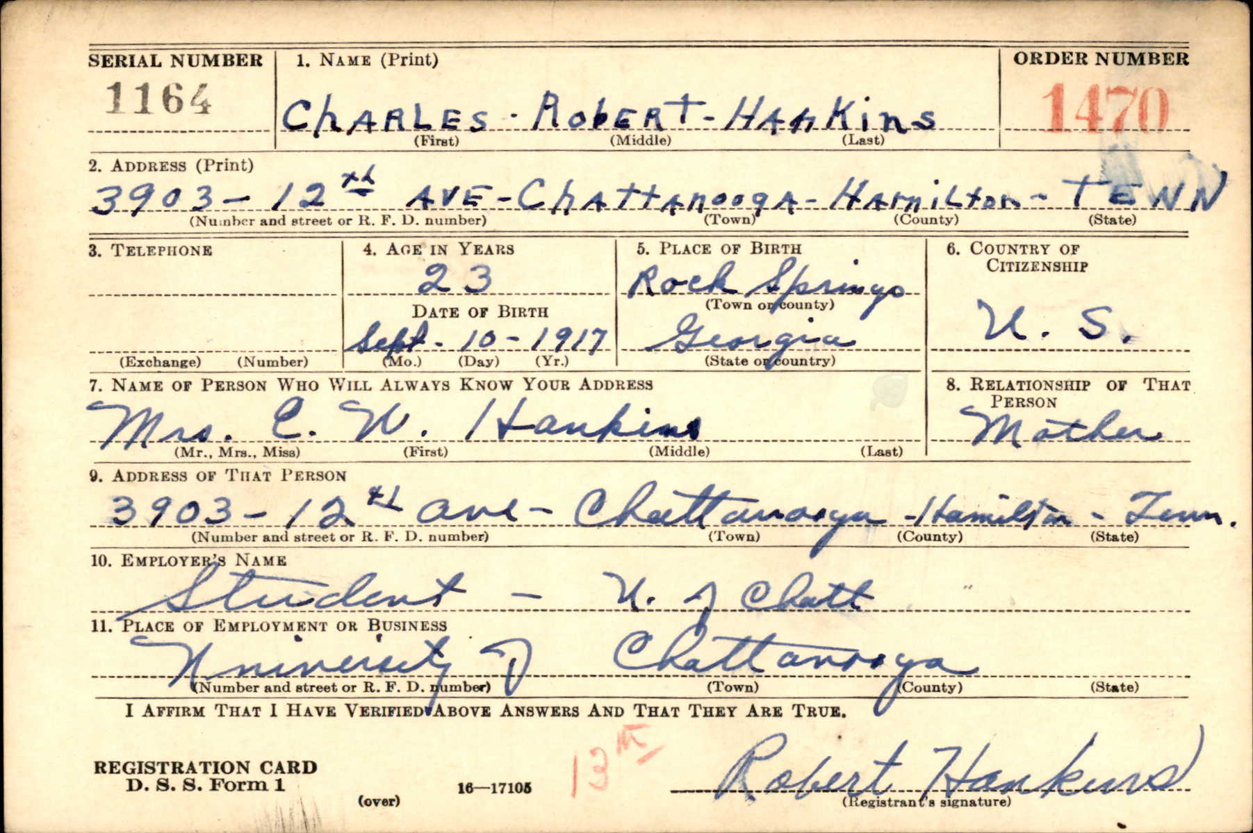 Charles Robert Hankins was born on 10 September 1917 at Rock Springs, Georgia to Emmet Washington Hankins and Mary Inez Weaver.