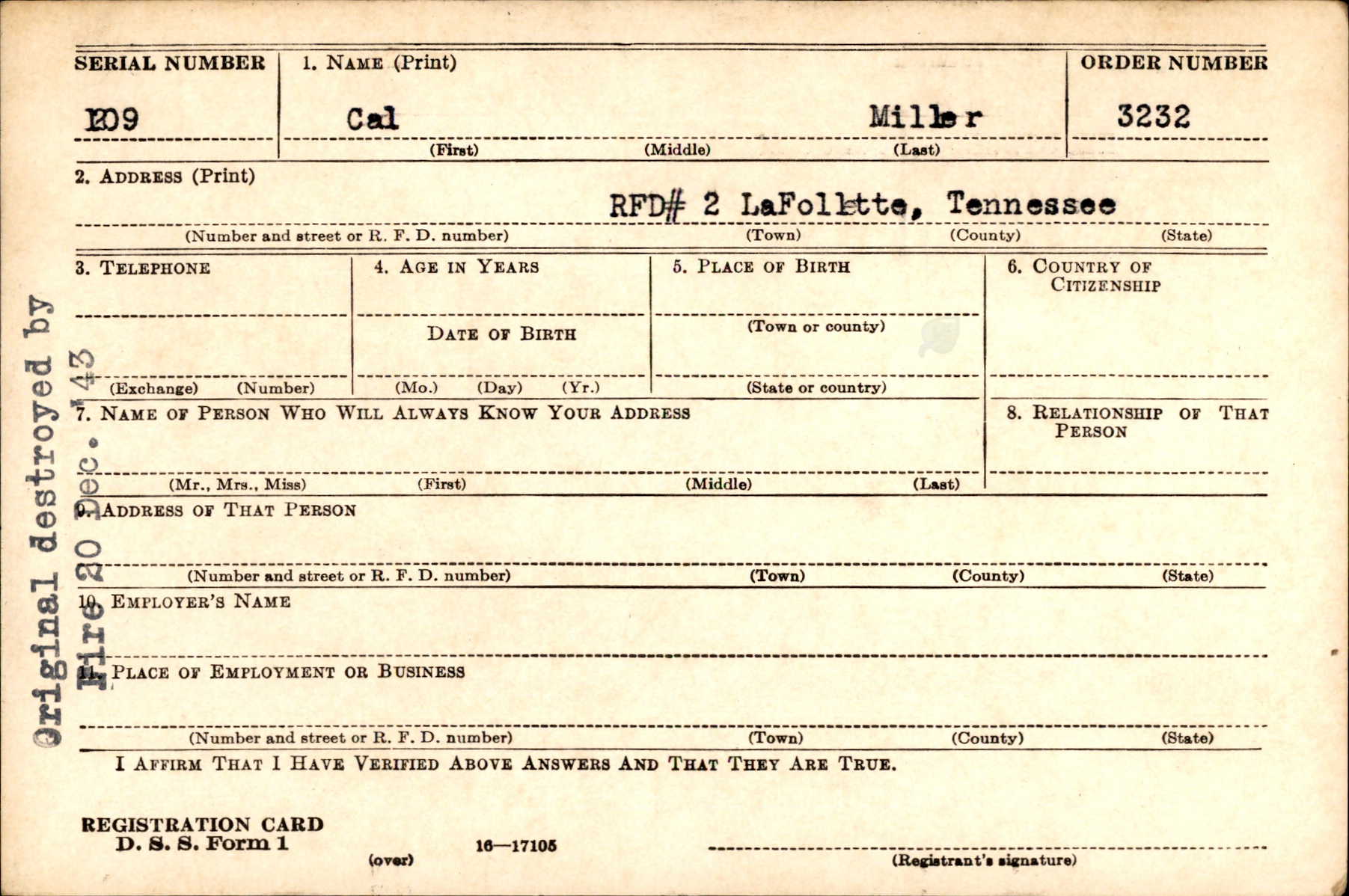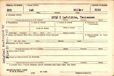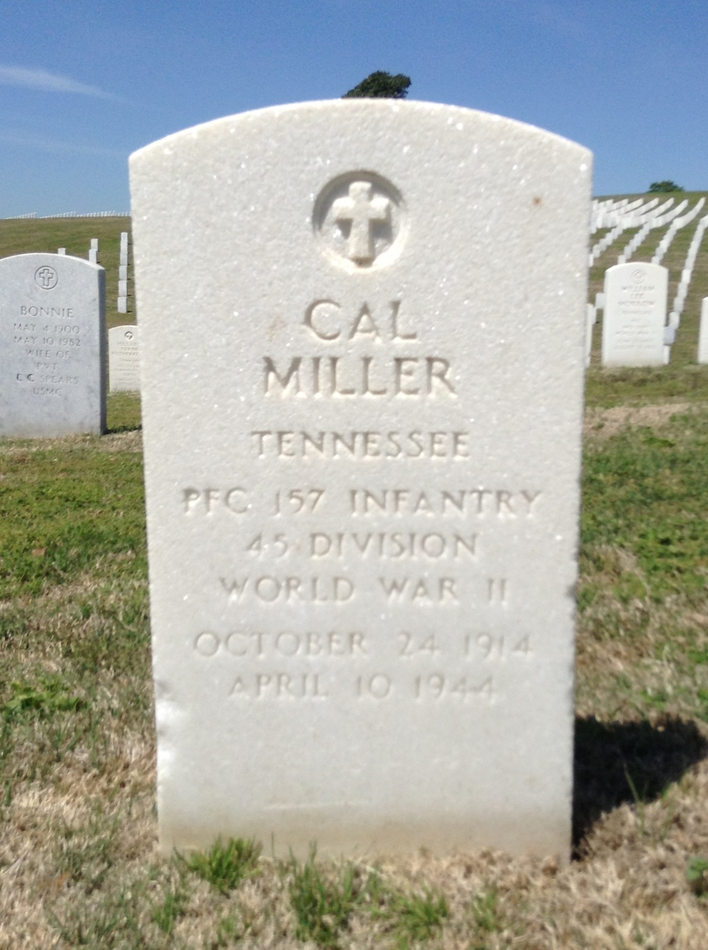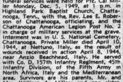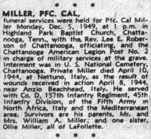 Funeral services were held for Pfc. Cal Miller, Monday, Dec. 5, 1949 in Highland Park Baptist Church, Chattanooga, Tenn. Interment was in U.S. National Cemetery, Chattanooga. Private Miller died April 10, 1944, at Nettuno, Italy, as the result of wounds received in action April 8, 1944, near Anzio Beachhead, Italy. He served with Co. D, 157th Infantry Regiment, 45th Infantry Division, of the Fifth Army in North Africa, Italy and the Mediterranean area. Survivors are his parents, Mr. and Mrs. William A. Miller; and one sister, Ollie Miller, all of LaFollette.