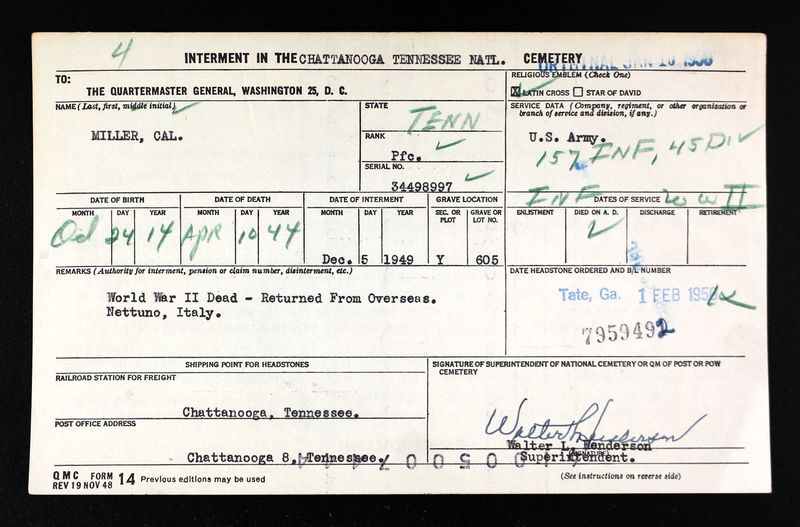 PFC Miller was returned from Nettuno, Italy. Buried at Chattanooga National Cemetery, Y, 605.