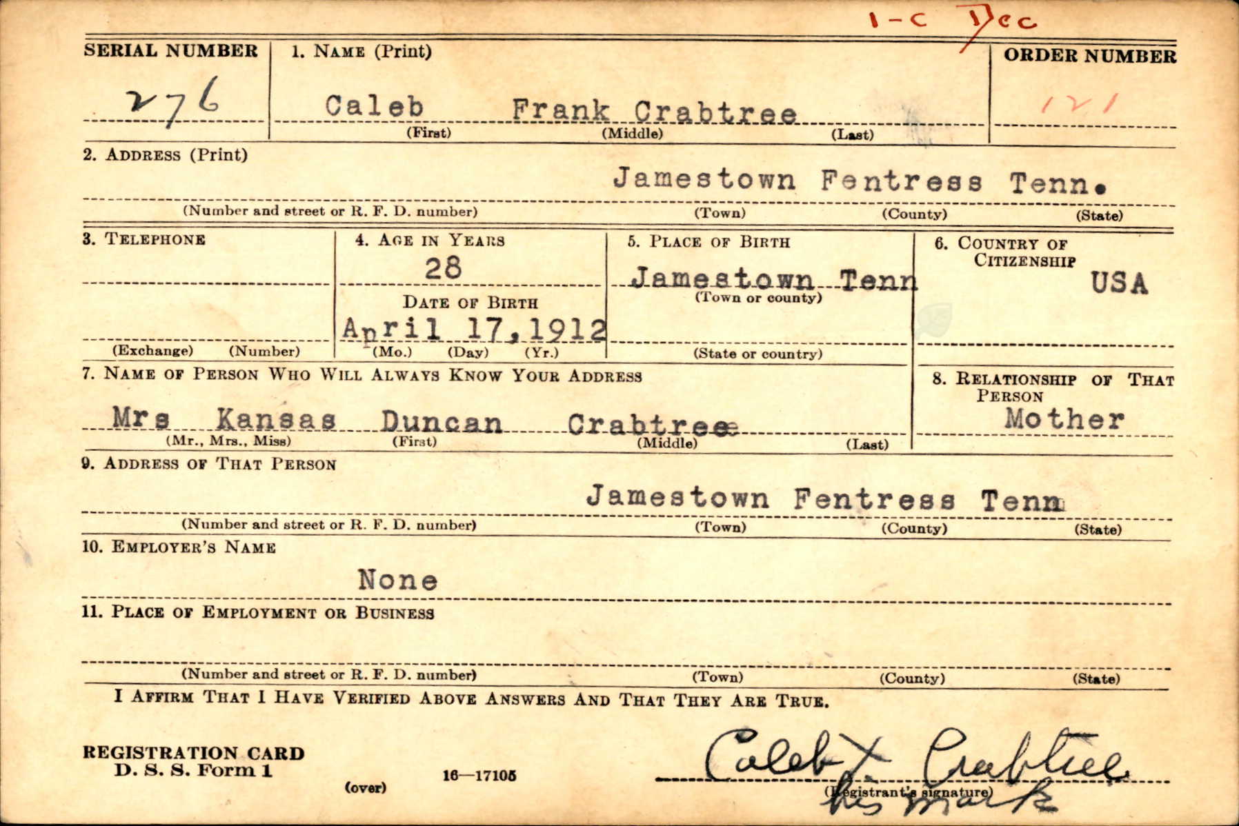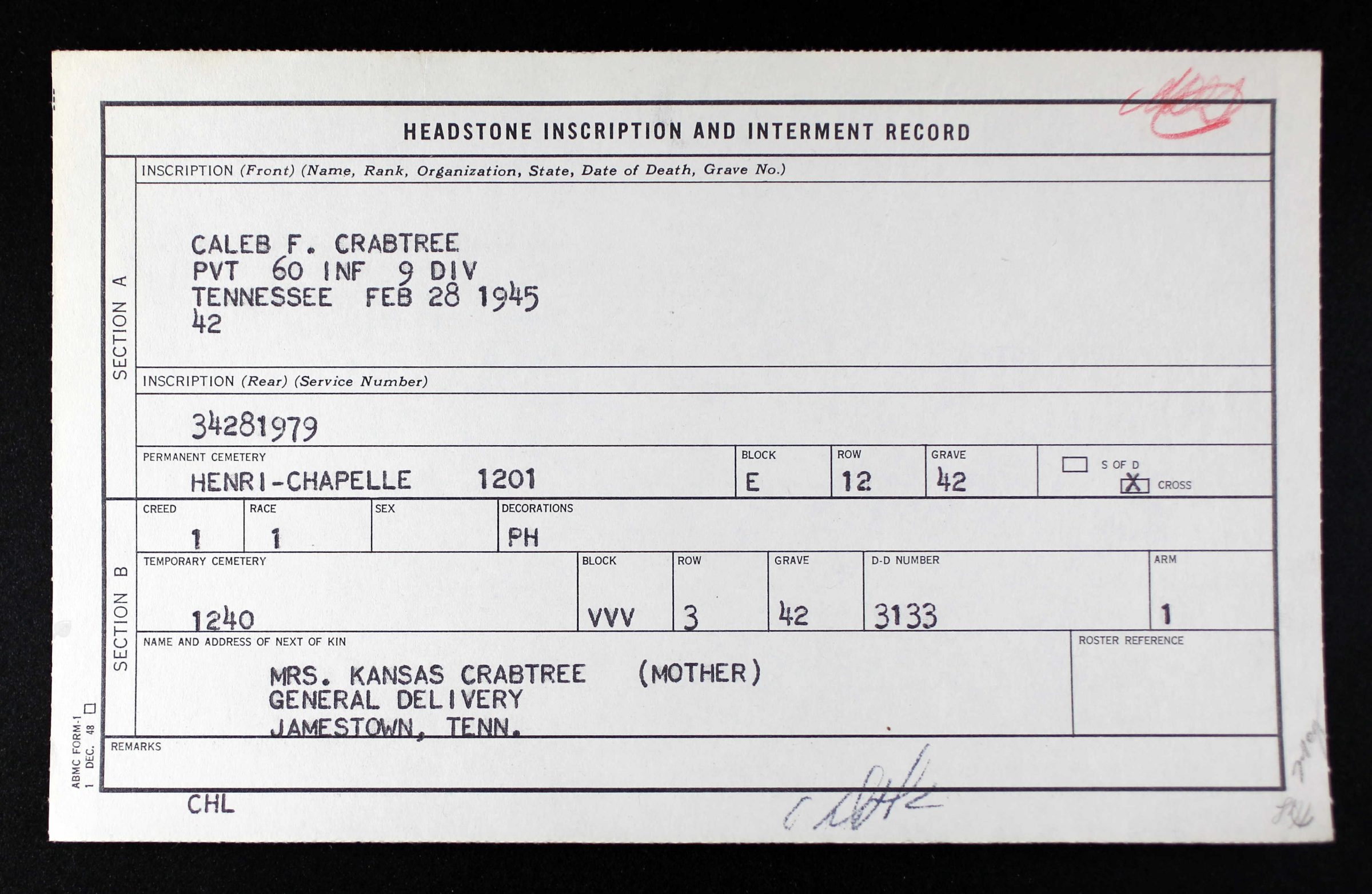 Caleb Frank Crabtree was born at Jamestown, Fentress County Tennessee, the son of James Wilburn Crabtree and Kansas O. Duncan. He had a brother, Cletus M. Crabtree. He was enlisted at Fort Oglethorpe Georgia on the 22nd of April 1942.