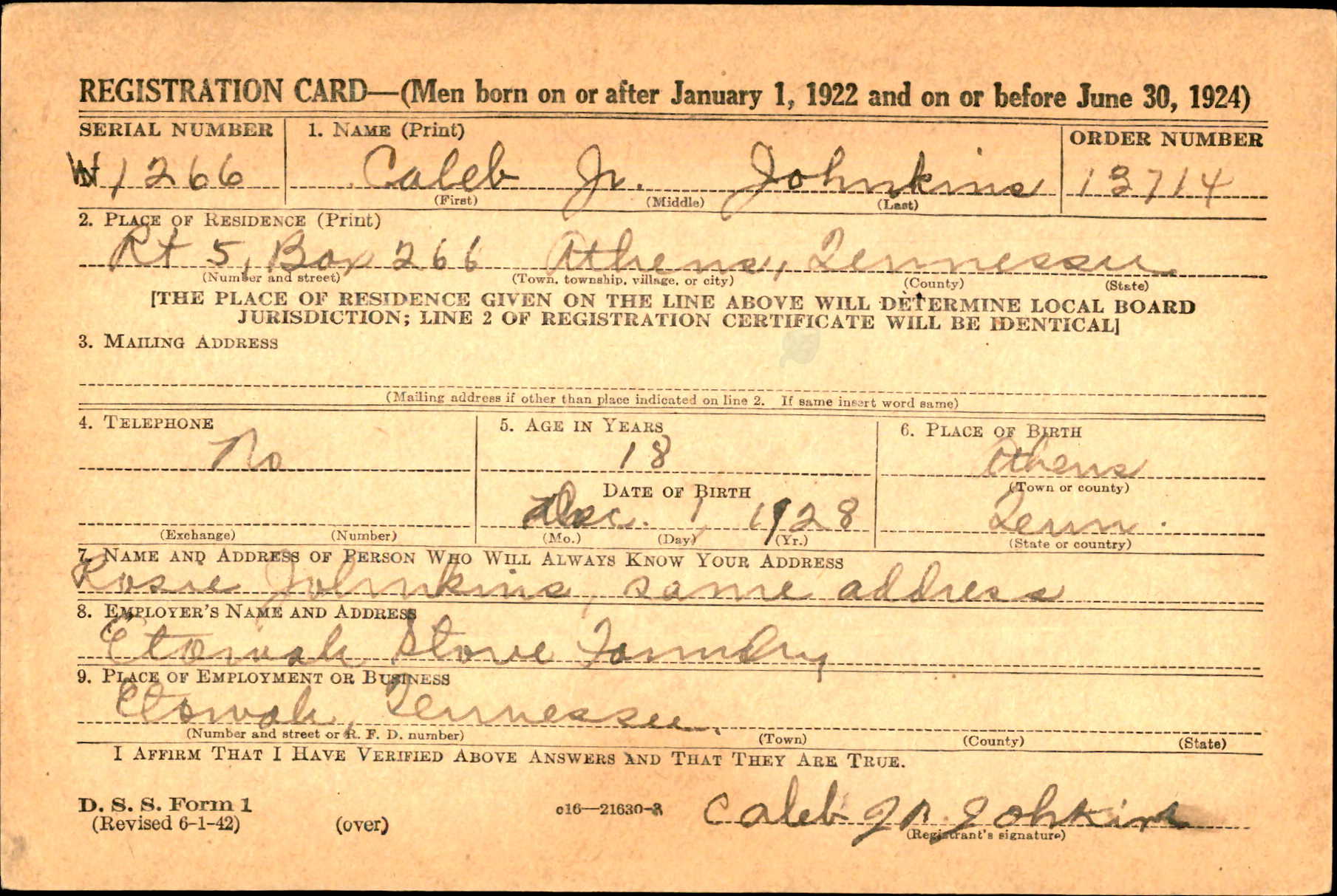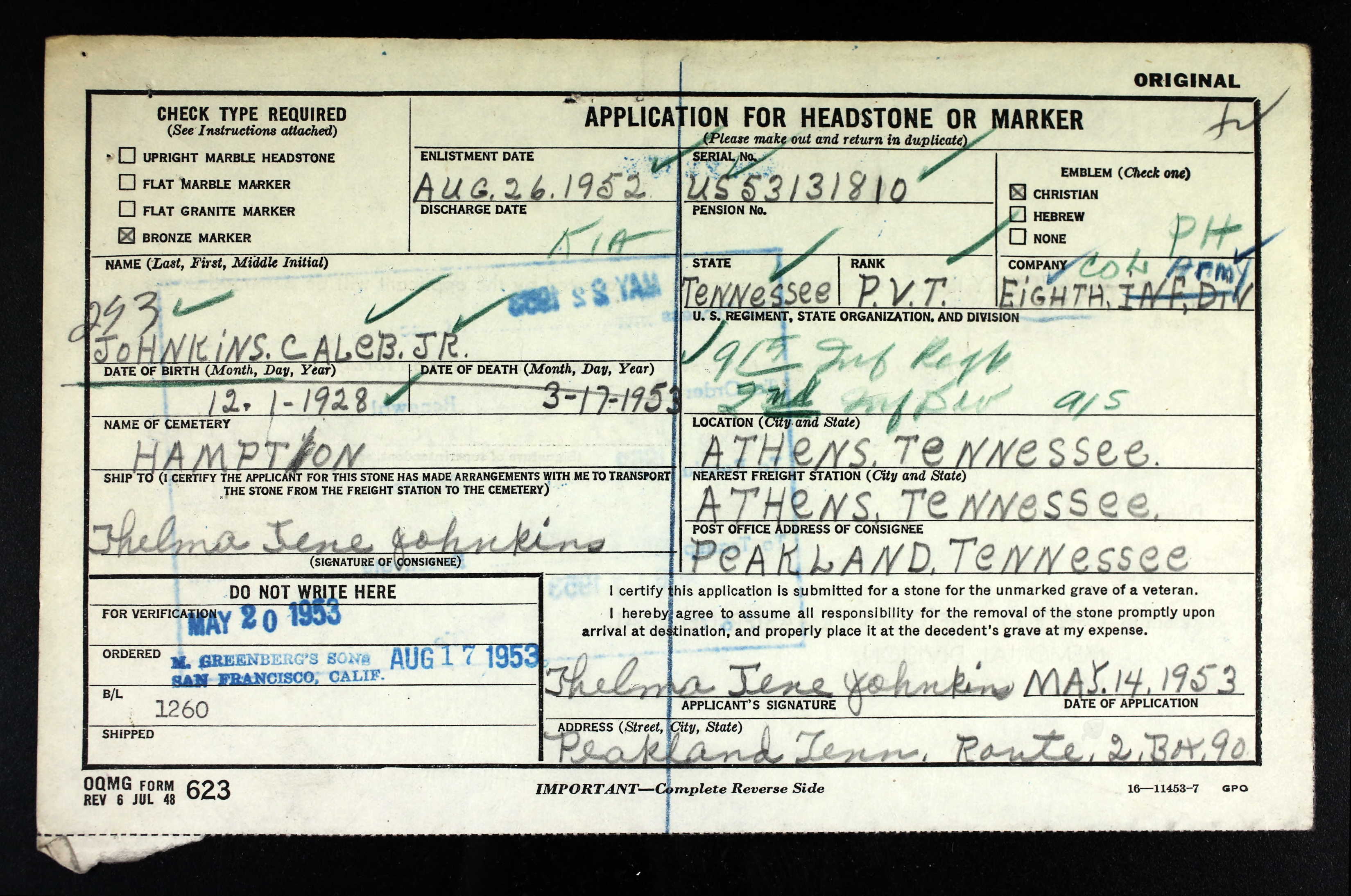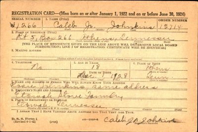 Caleb Johnkins Jr. was the son of Caleb Johnkins Sr. and Rosa Lee Cox. He married Thelma Jean Robinson on 24 February 1952 in McMinn, Tenn.