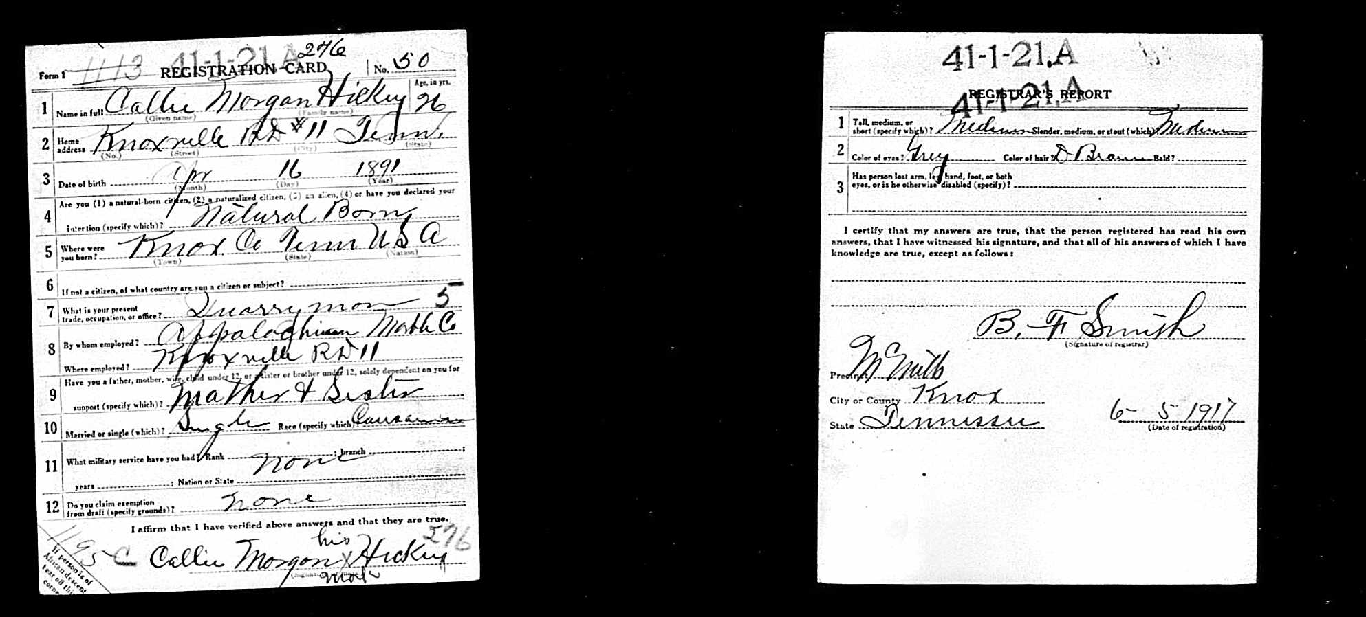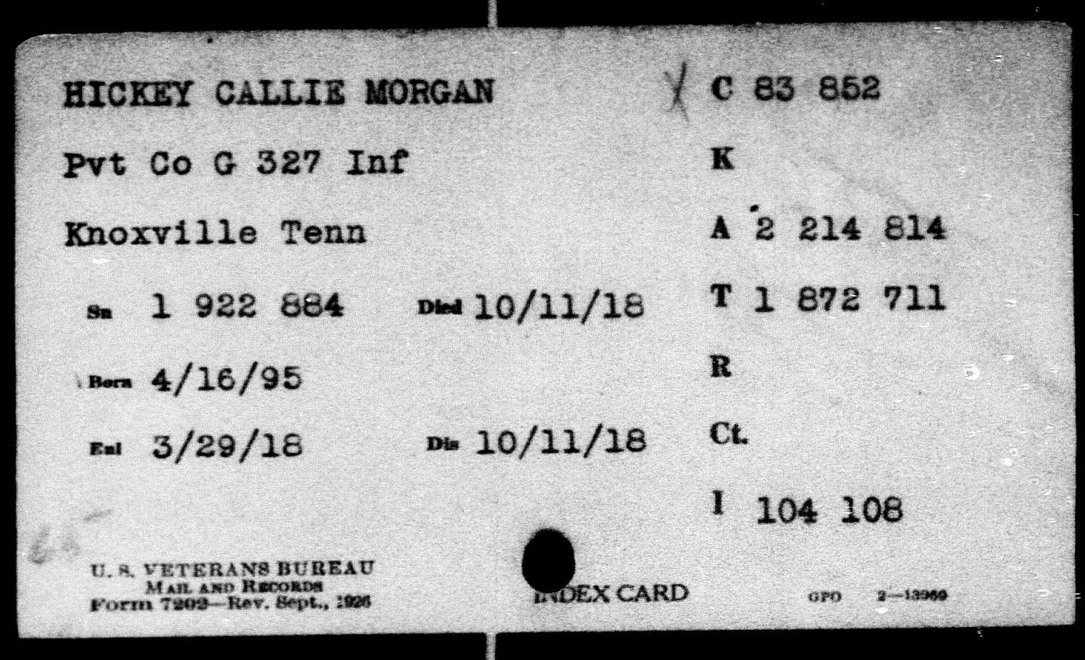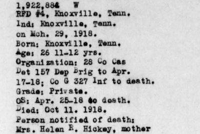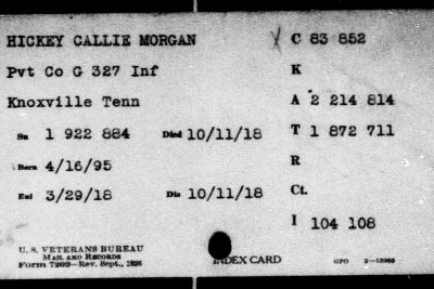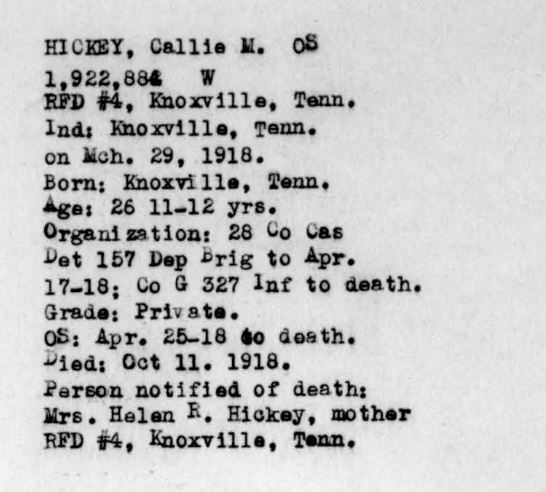 Callie Morgan Hickey, after induction into service at Knoxville on March 29, 1918, was ordered to Camp Gordon, GA, for training. After a short assignment with 28th Company, 157th Depot Battalion, he was transferred to Company G, 327th Infantry, 82nd Division. Sailing April 18 for overseas duty, he took part in all fighting of his unit until October 11, 1918, when he was killed in action in the Argonne Forest. He died at the age of 26.