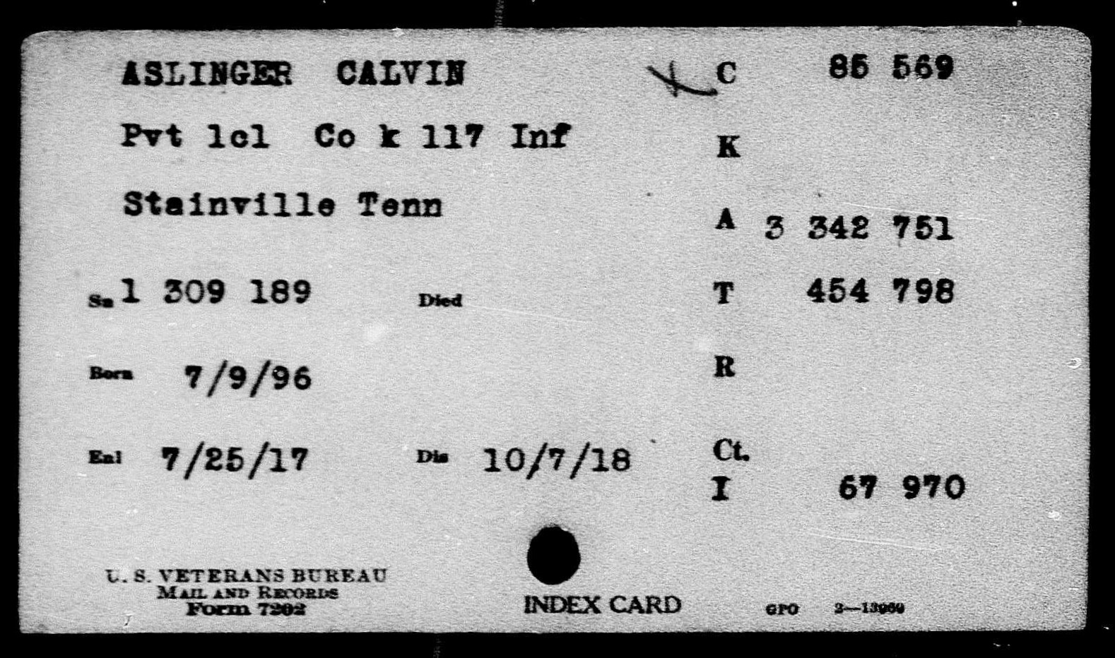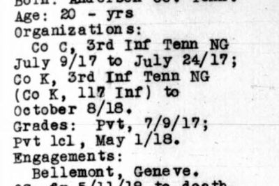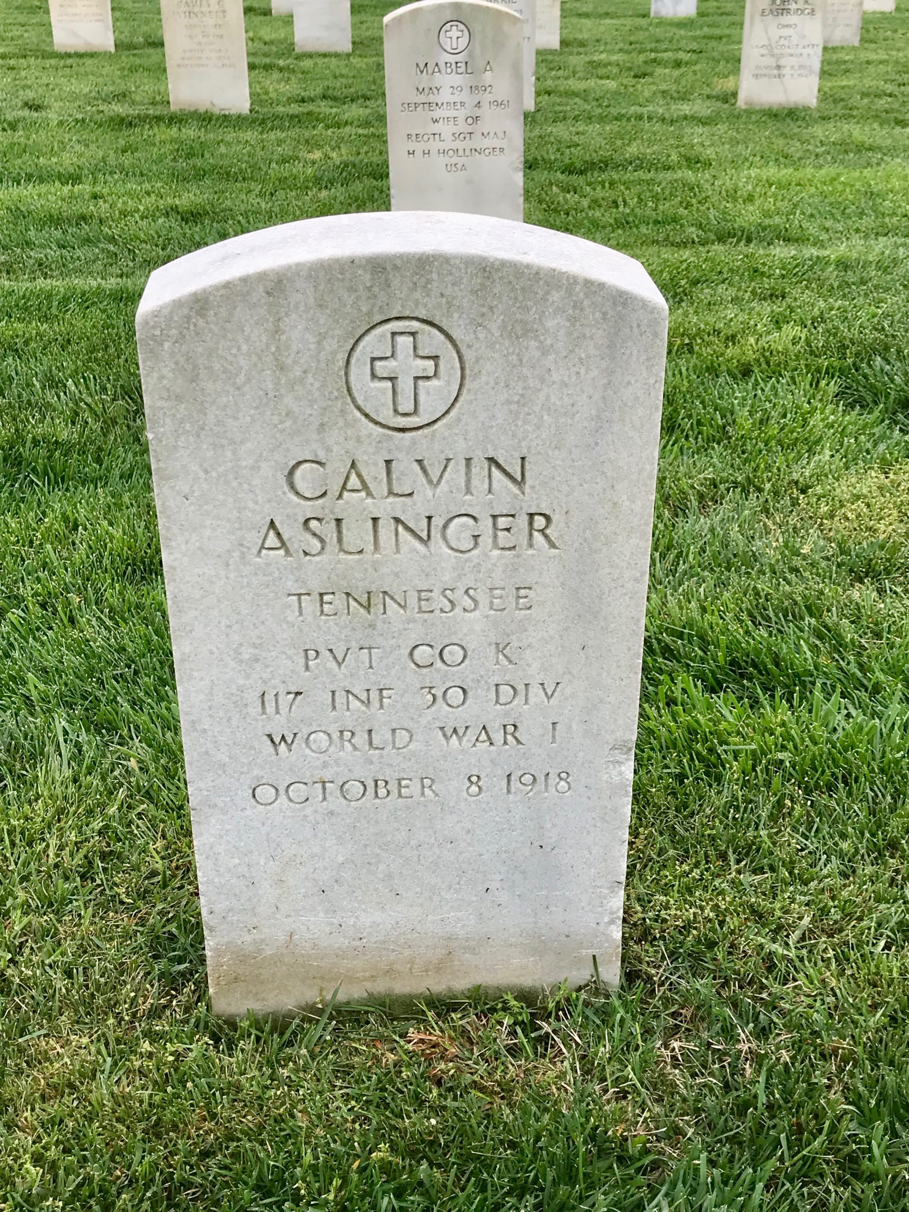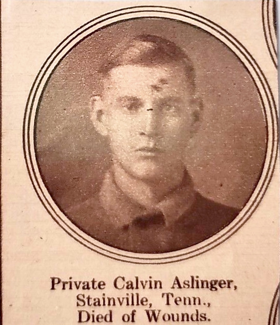Private Calvin Aslinger was born in May 1896. He was the son of James A. Aslinger and Hannah Braden Aslinger. He had one sister, Mary Aslinger Patterson, and one half-brother, Hiram A. Alsinger. In 1900, he and his mother were living with his sister and her husband, Melton Patterson, in Stainville, Tennessee. As an adult, Private Aslinger moved to Switchback, West Virginia where he worked as a miner. During his service in World War I, Private Aslinger served in Company K, 117th Infantry, 30th Division. He died of wounds in France on October 8, 1918. He was initially buried at the British Military Cemetery, Bouciy, Somme, France. He is buried in Knoxville National Cemetery (Section B, Site 3674).