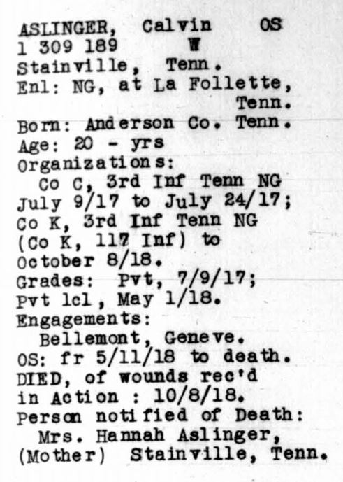 Private Calvin Aslinger was born in May 1896. He was the son of James A. Aslinger and Hannah Braden Aslinger. He had one sister, Mary Aslinger Patterson, and one half-brother, Hiram A. Alsinger. In 1900, he and his mother were living with his sister and her husband, Melton Patterson, in Stainville, Tennessee. As an adult, Private Aslinger moved to Switchback, West Virginia where he worked as a miner. During his service in World War I, Private Aslinger served in Company K, 117th Infantry, 30th Division. He died of wounds in France on October 8, 1918. He was initially buried at the British Military Cemetery, Bouciy, Somme, France. He is buried in Knoxville National Cemetery (Section B, Site 3674).