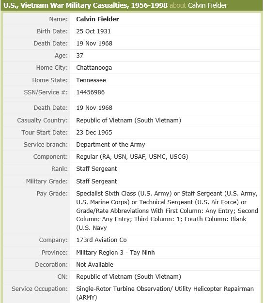 SSGT Calvin Fielder, DOB Oct 25, 1931, serial number RA14456986, From Chattanooga, Tennessee, killed in a helicopter crash on Nov 19th, 1968. Crash was due to a hanger bearing failure causing lost tail rotor control. He, and I, were assigned to the 173rd Assault Helicopter Company, 11th Battalion, 1ST Aviation Brigade, Lai Khe Airfield. Rep. of So. Vietnam.