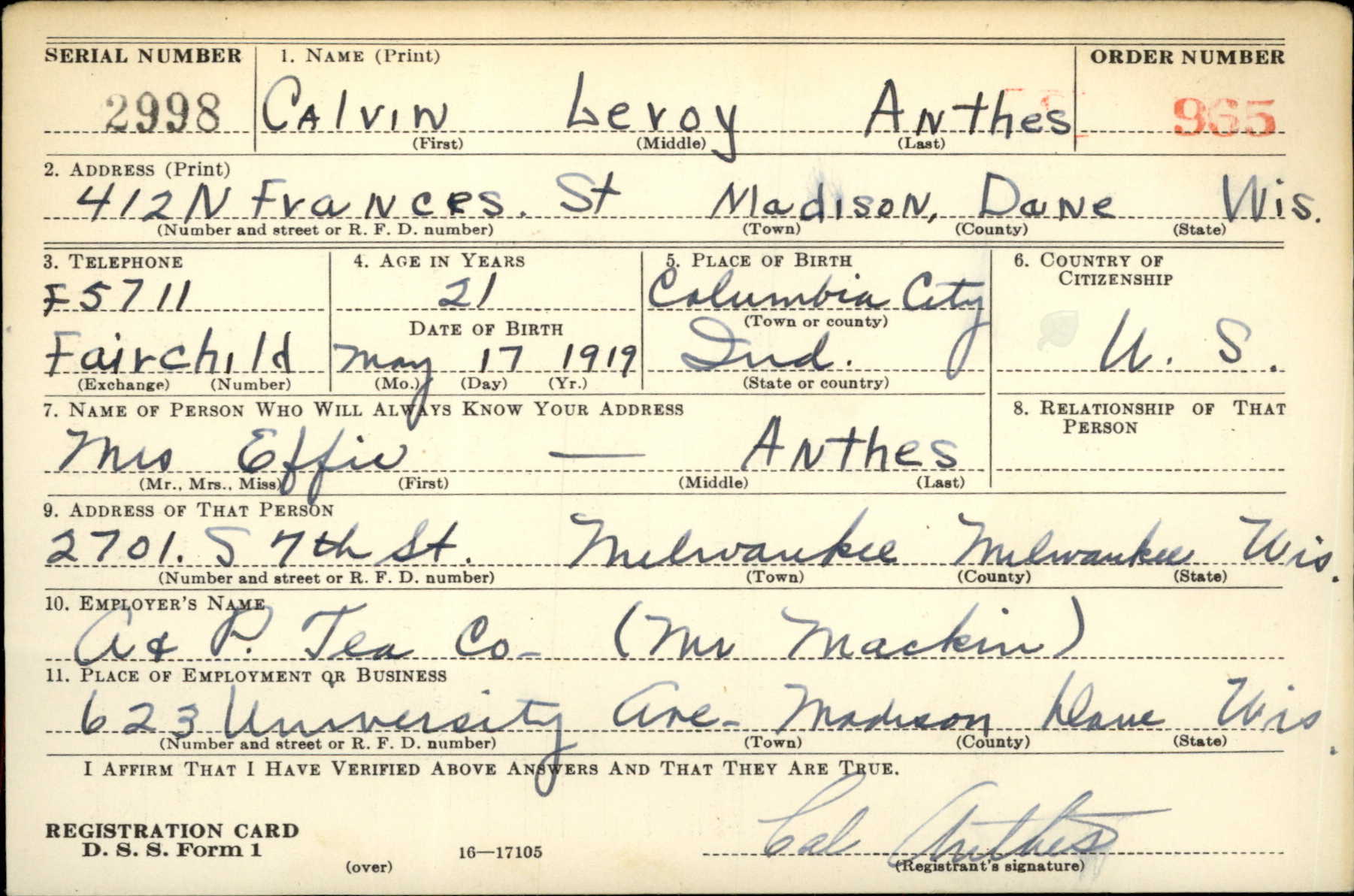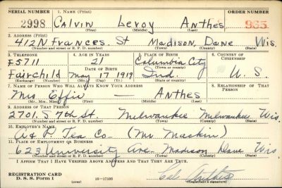 Calvin Leroy Anthes was born in Indiana, son of Arhtur A. Anthes and Effie Ovanda Price. He was a 1937 graduate of Rensselaer High School. He was a member of both football and basketball teams. While the family lived in Rensselaer they operated a restaurant.