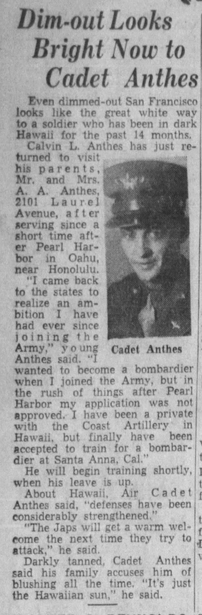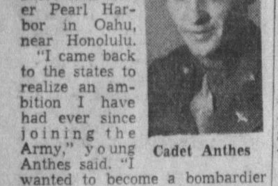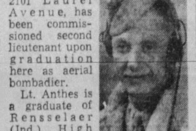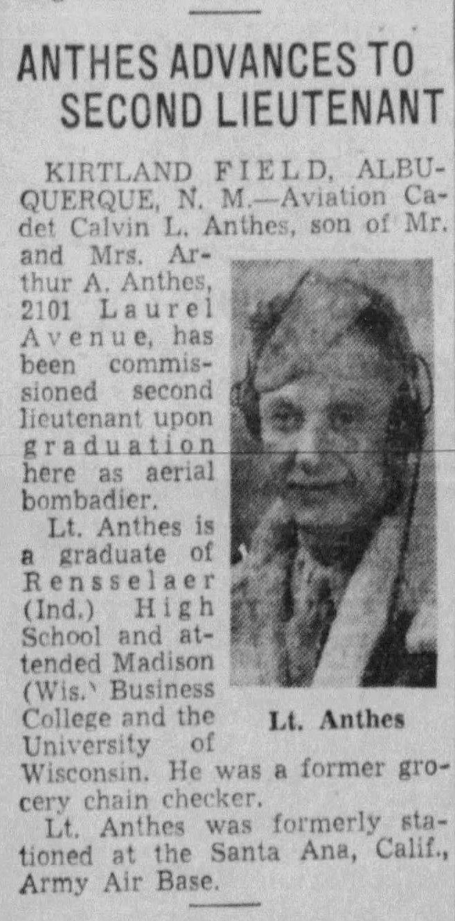 Kirtland Field, Albuquerque, N.M. – Aviation Cadet Calvin L. Anthes, son of Mr. and Mrs. Arthur A. Anthes, 2101 Laurel Avenue, has been commissioned second lieutenant upon graduation here as aerial bombardier. Lt. Anthes is a graduate of Rensselaer (Ind.) High School and attended Madison (Wis.) Business College and the University of Wisconsin. He was a former grocery chain checker. Lt. Anthes was formerly stationed at the Santa Ana, Calif., Army Air Base.