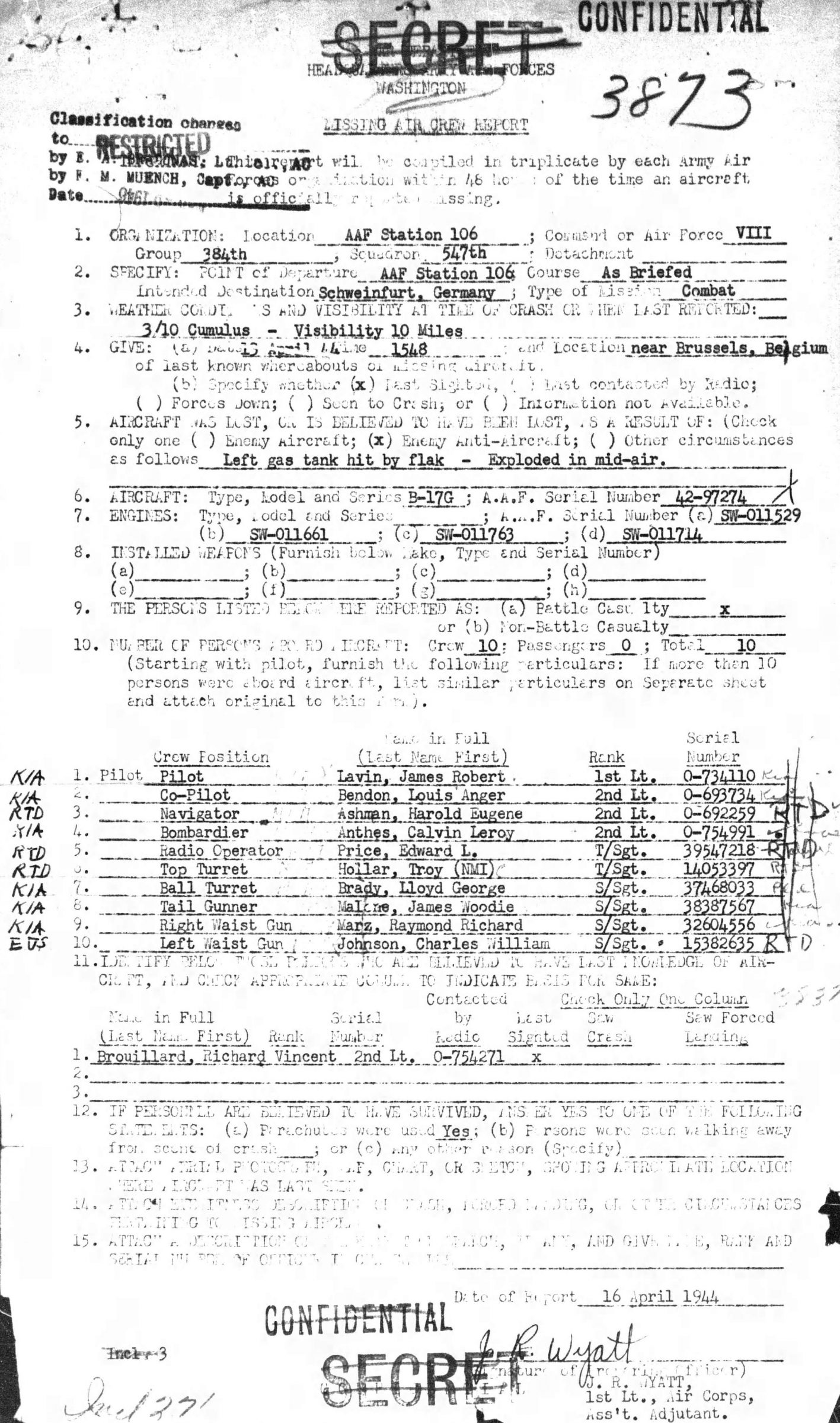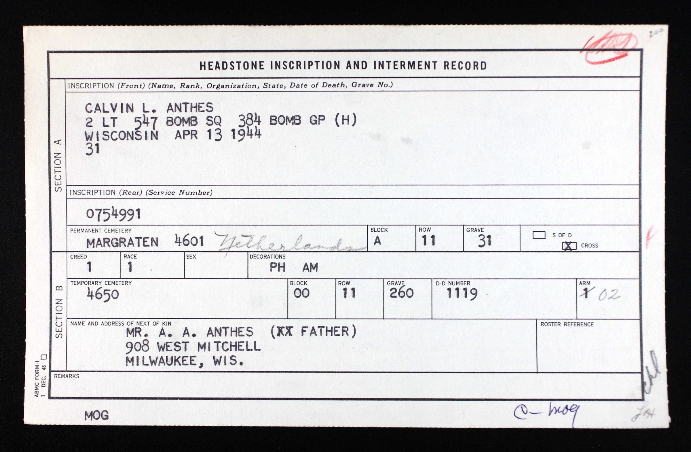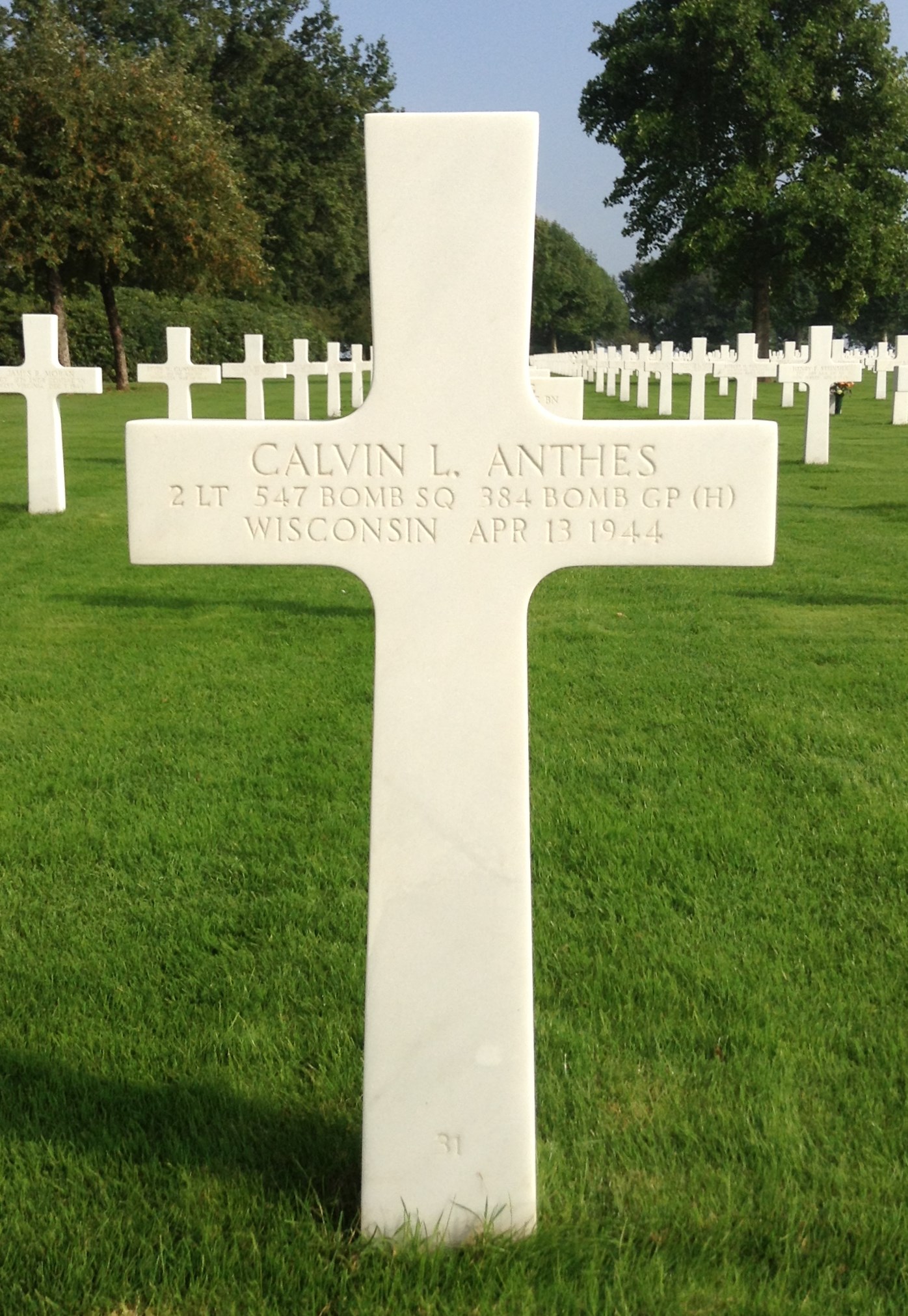On 13 April 1944, aircraft B-17G, serial number 42-97274 was on a combat mission to Schweinfurt, Germany. The aircraft was flying no. 5 position in the Lead Squadron. At 1548 hours, over Brussels the aircraft was struck by flak in the no. 2 and no. 3 engines. Shortly thereafter the ship exploded in mid-air. The remains of 2nd Lt Anthes were found at the crash point at Fouleng, 18 Km North of Mons, Belgium. He had several bone fractures. Calvin Anthes was initially buried at the cemetery in Chièvres, comrade grave nr. 12 on 15 April 1944.