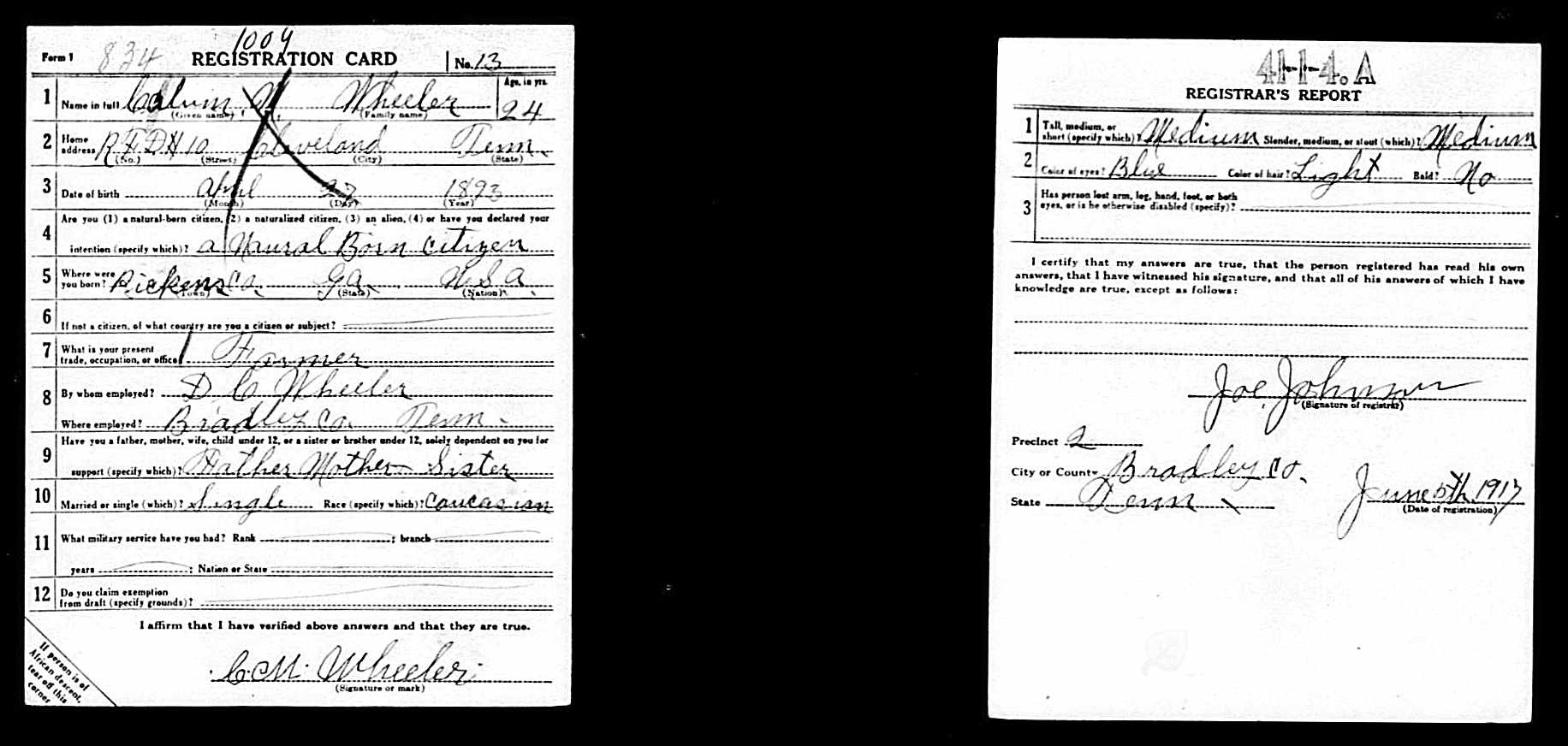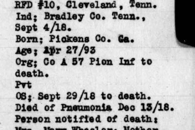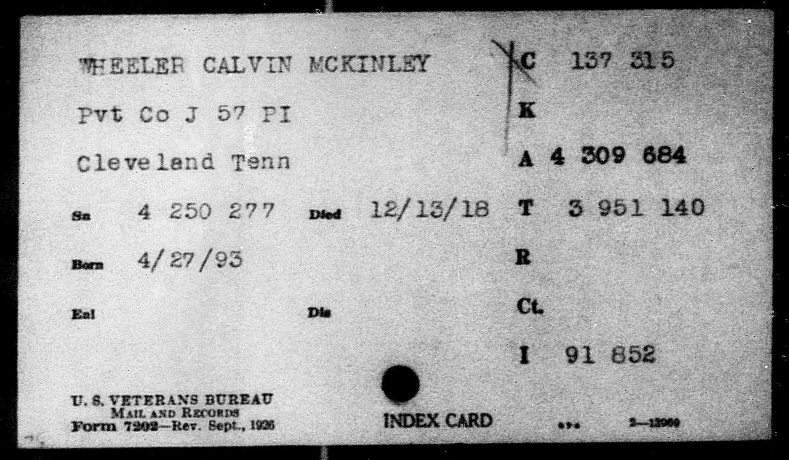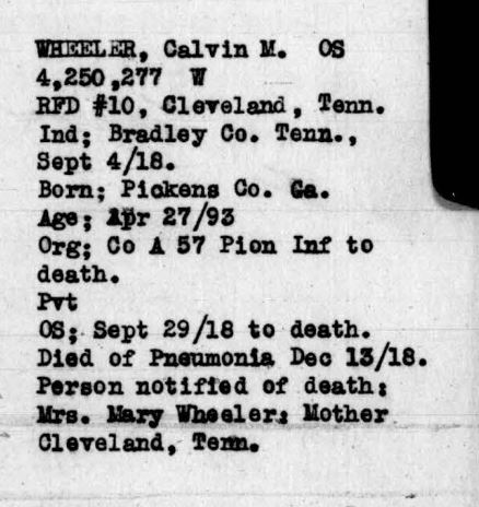 Calvin McKinley Wheeler was born 27 April 1893, Pickens County, Georgia, son of Mary Wheeler. He enlisted on 4 September 1918 in Bradley County, Tennessee. He died of pneumonia on 13 December 1918 in France.