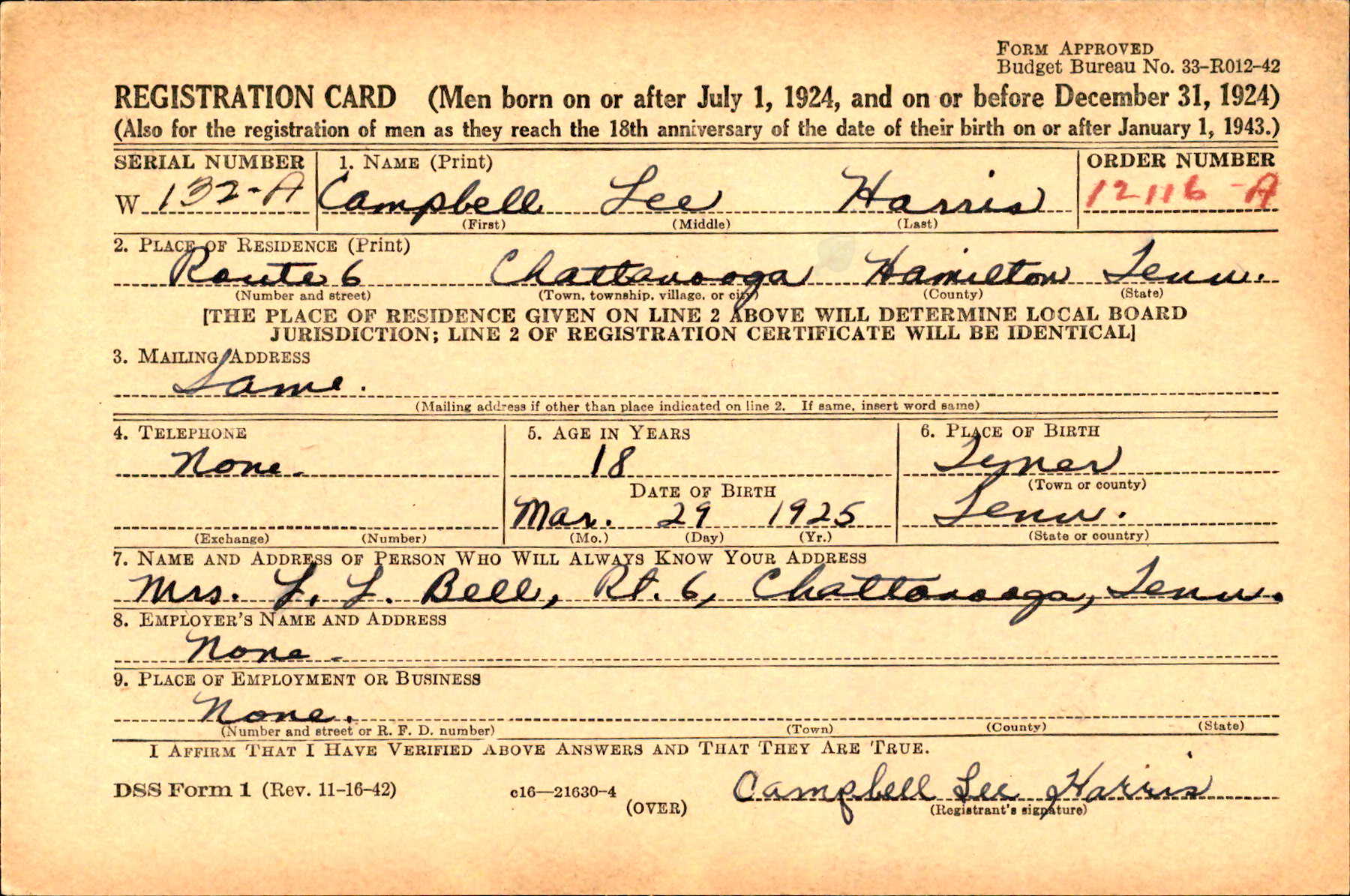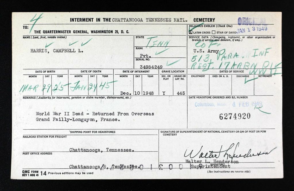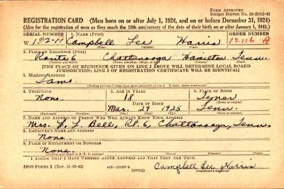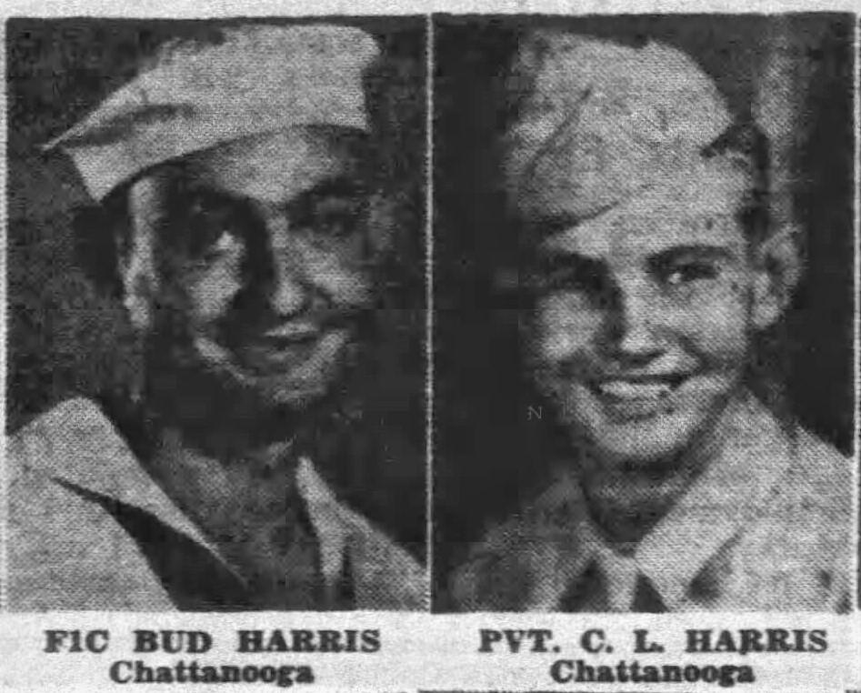 Pvt. Campbell L. Harris, son of Mrs. L.L. Bell, Route 1, Chattanooga, and Jim Harris, Ooltewah, Route 1, has been listed killed in action Jan. 24 in Belgium, according to information received by parents. Former Tyner High student, Harris worked in a shipyard in Savannah prior to entering the service. He is survived by two sisters, Mrs. Ernest Price, North Moore Road; Mrs. Thomas L. Fryar, Chattanooga, Route 1; two brothers, Bud Harris, who is serving with the navy in the Atlantic, and Clifford Harris, 1910 Dodds Avenue.