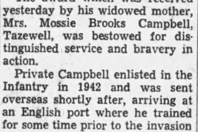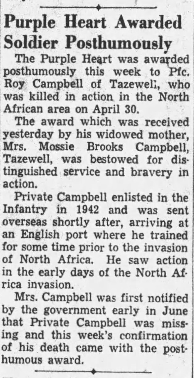 The Purple Heart was awarded posthumously this week to Pfc. Roy Campbell of Tazewell, who was killed in action in the North African area on April 30. The award which was received yesterday by his widowed mother, Mrs. Mossie Brooks Campbell, Tazewell, was bestowed for distinguished service and bravery in action. Private Campbell enlisted in the infantry in 1942 and was sent overseas shortly after, arriving at an English port where he trained for some time prior to the invasion in North Africa. He saw action in the early days of the North African invasion. Mrs. Campbell was first notified by the government early in June that Private Campbell