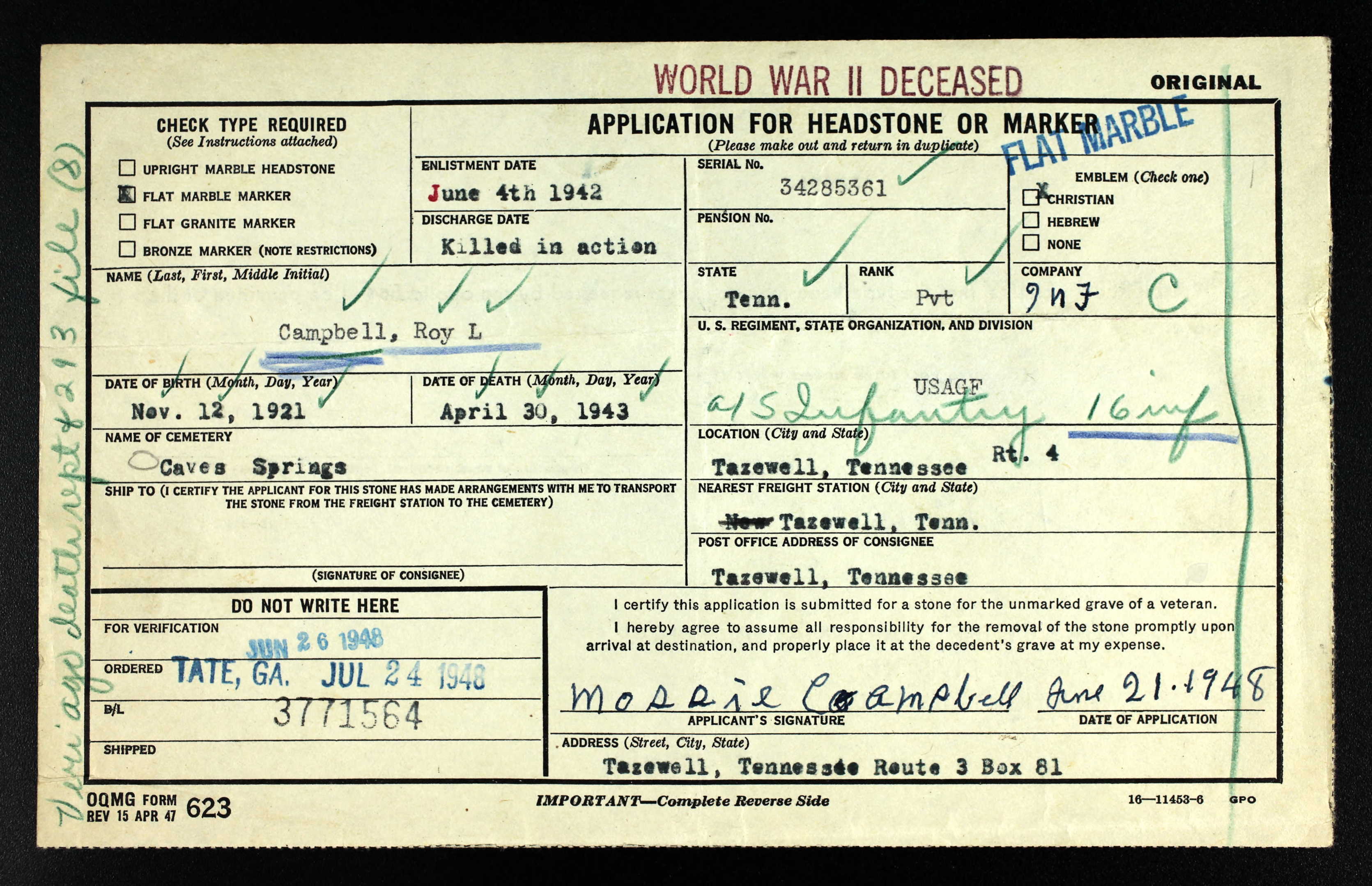 Served with the 16th Infantry Regiment, 1st Infantry Division. He was killed on 30 April 1943 during combat near Mateur, Tunisa in the assault on Hill 523. Buried at Cave Springs Baptist Church Cemetery in Cave Spring, Claiborne County, Tennessee.