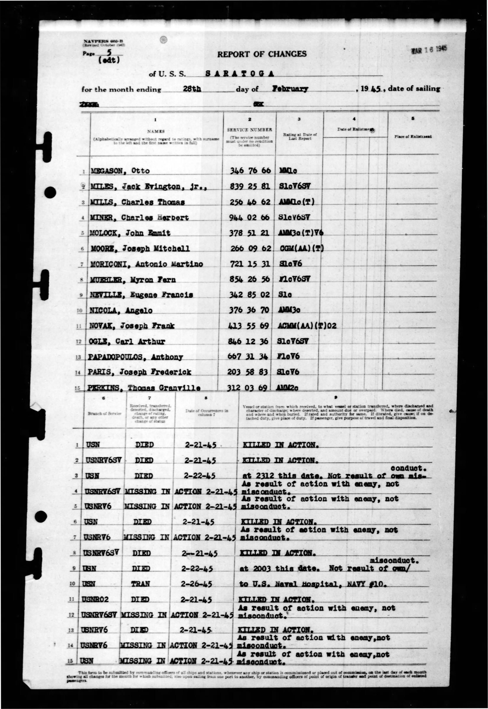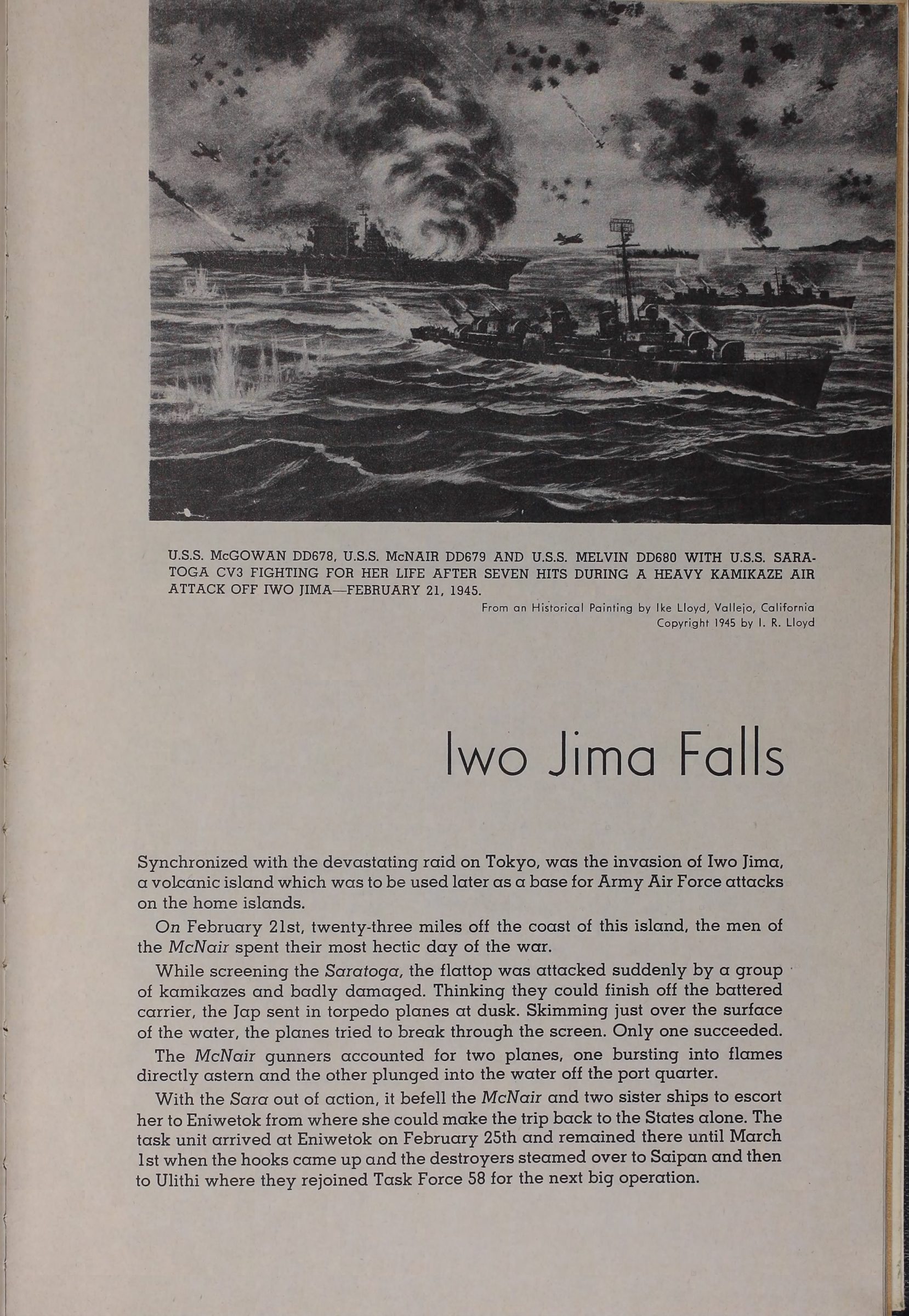 After fighting through three years and three months with suffering an enemy bomb hit, the luck of the Navy aircraft carrier USS Saratoga ran out on February 21 in operations at Iwo Jima. Suffering from seven Jap hits, the carrier never-the-less made her way back to Puget Sound Navy yards at Bremerton, Wash. under her own power. The hits struck the carrier causing 315 casualties. The casualties included 123 killed, missing or dead of wounds and 192 wounded. The navy described the action against “Sara” as one of the most concentrated attacks in which a carrier has survived, which might have sunk any other ship.