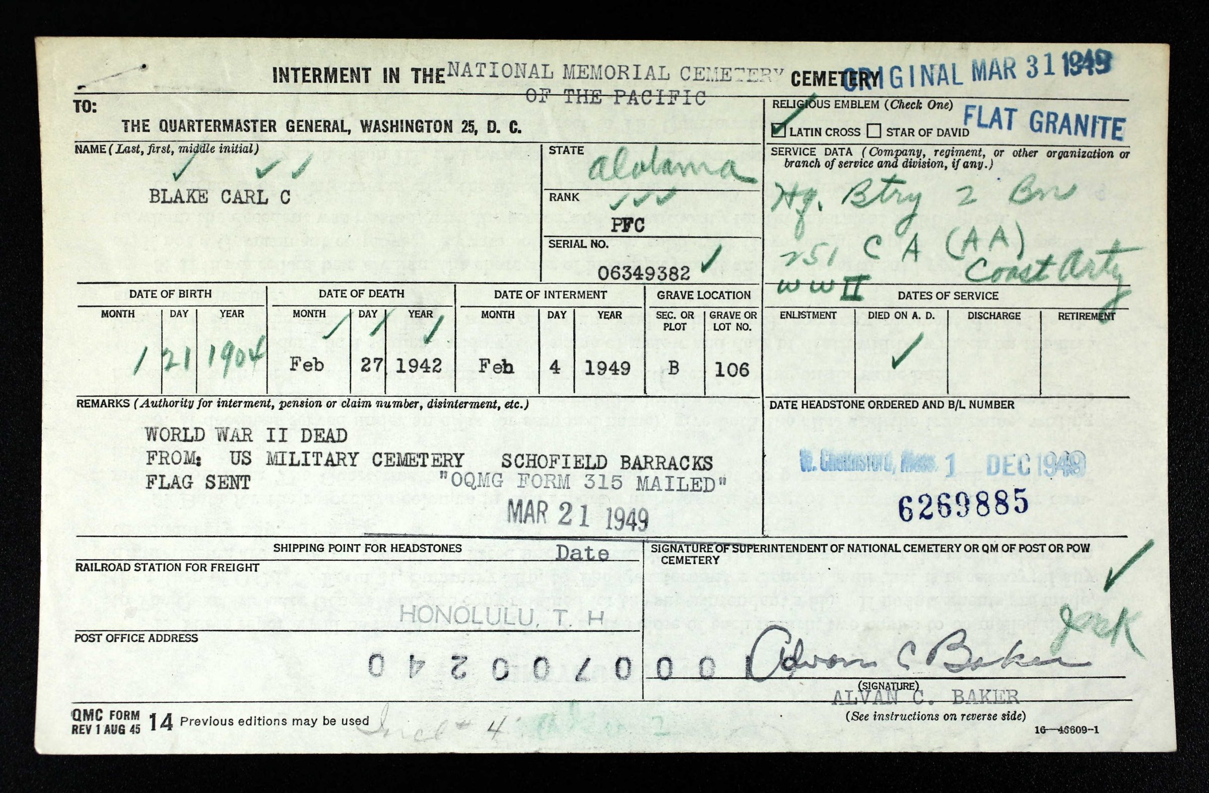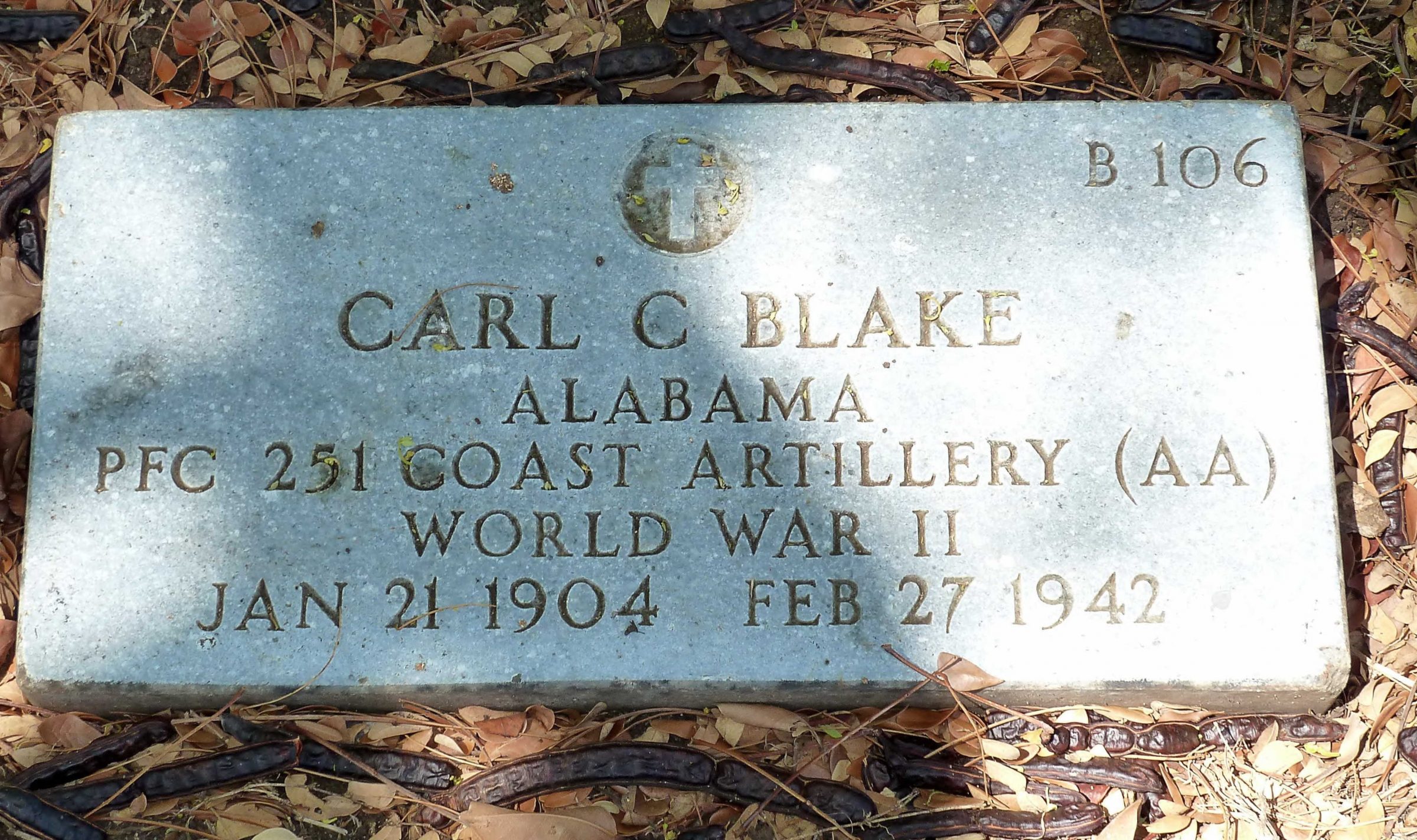 Carl Clifton Blake was the son of Albert Hamilton Blake and Mary Ann Cox. He married Cresie Lucile Moore on 28 May 1921 at west Blockton, Alabama. Their daughter Margaret Elaine Blake was born in 1922. According to the 1930 he was no longer married and lived at the same address as his mother and step-father, Henry A. David. His father had died in 1912. In 1930, Carl Blake signed up for three years’ service in the Sixth cavalry, Fort Oglethorpe, after finishing duty with the Second Cavalry at Fort Eustis, Va. In 1938 he re-enlisted in the 15th field artillery. He served in Texas and Hawaii.