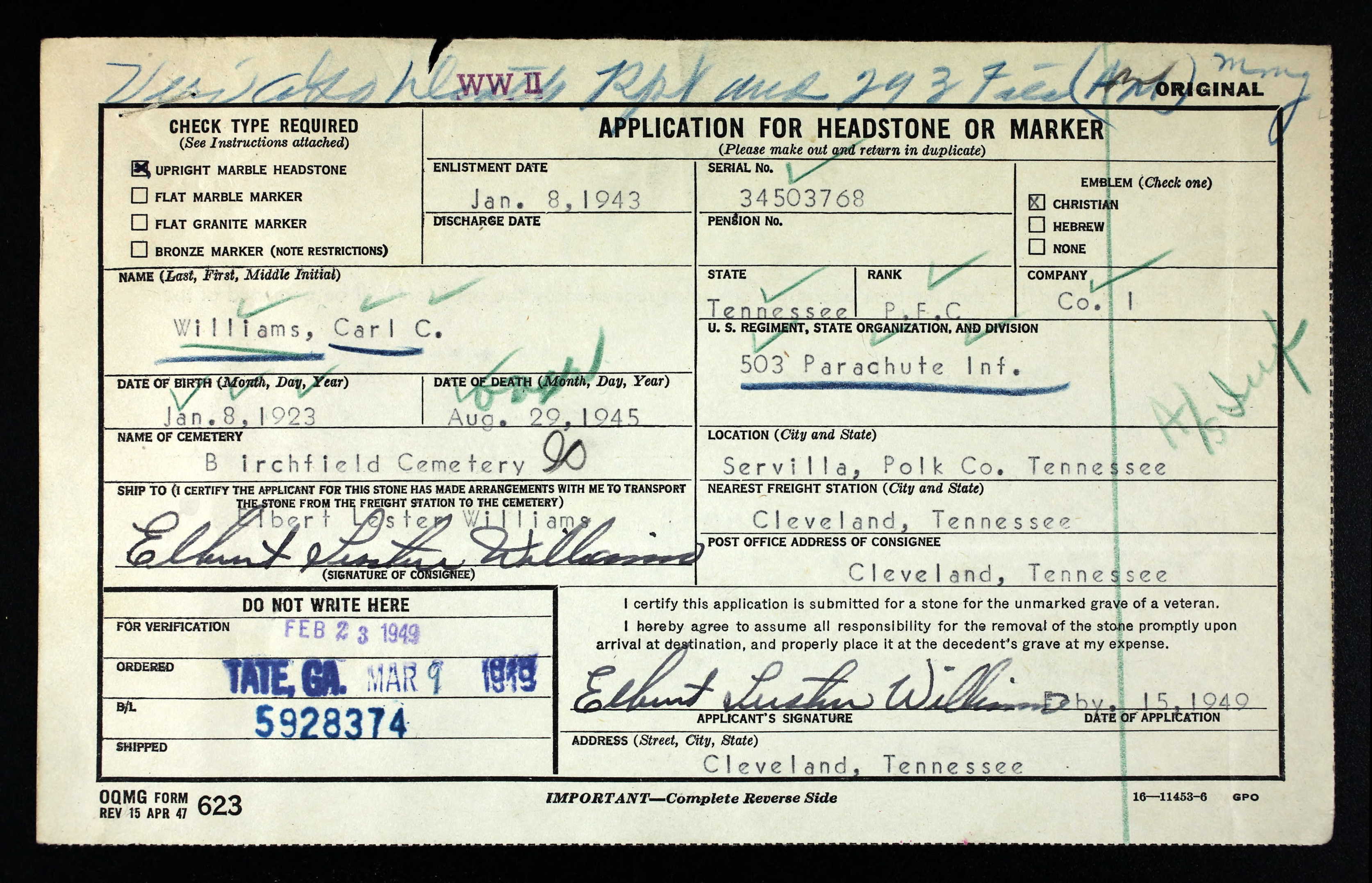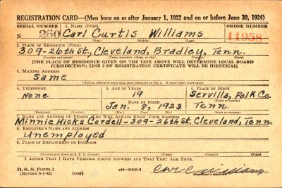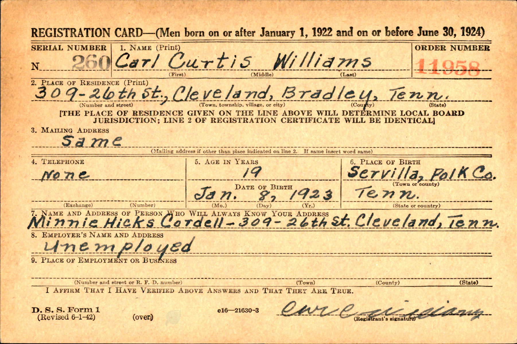 Carl Curtis Williams was born on 8 January 1923 in Cervilla, Polk County, Tennessee.