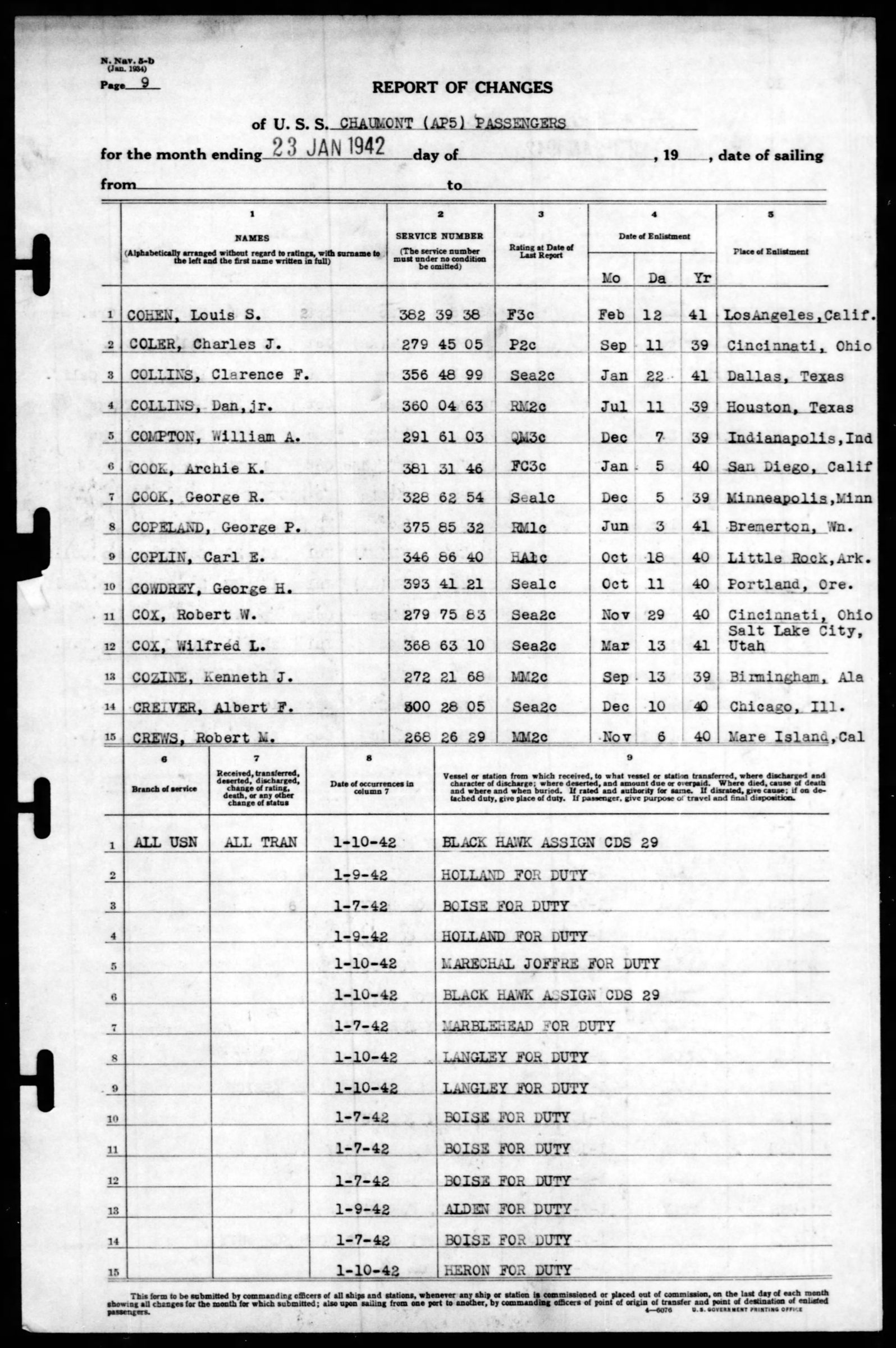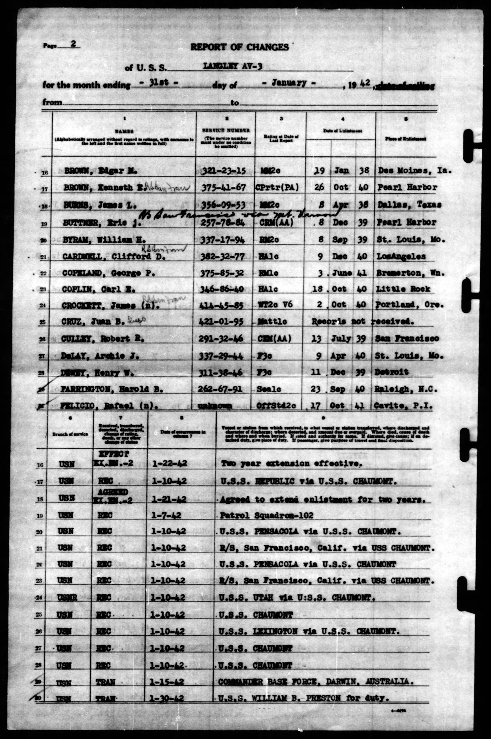 He was a passenger on the U.S.S. Chaumont (AP5) and was transferred the the U.S.S. Langley (AV-3) on 10 January 1942. He is memorialized at the American Cemetery at Manila.