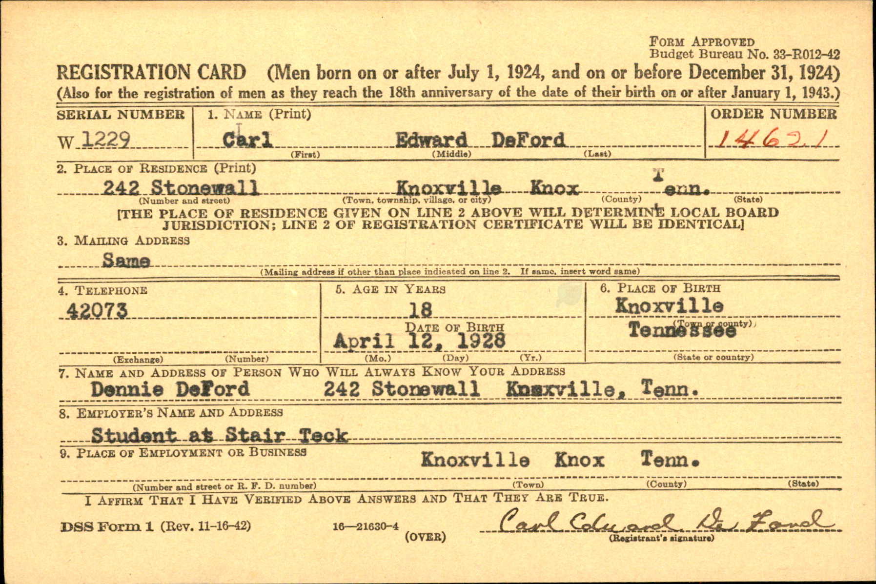 Carl Edward DeFord was the son of Dennie D. and Pearl A. DeFord of 1330 Tennessee Avenue. Carl was born April 12, 1928, in Knoxville and was the only child born to the DeFord family. He was a member of Tennessee Avenue Baptist Church and attended Rule High School for three years. During his time at Rule High School, he was a member of the football team and enjoyed other outdoor sports. Carl joined the Unites States Army and left Knoxville on March 10, 1951. He arrived in Korea on April 13, 1951 and was assigned to the 35th Regiment of the 25th Division also known as the Tropic Lightning Division.