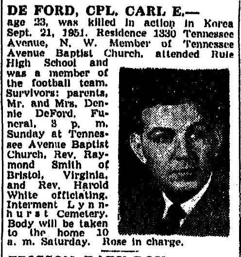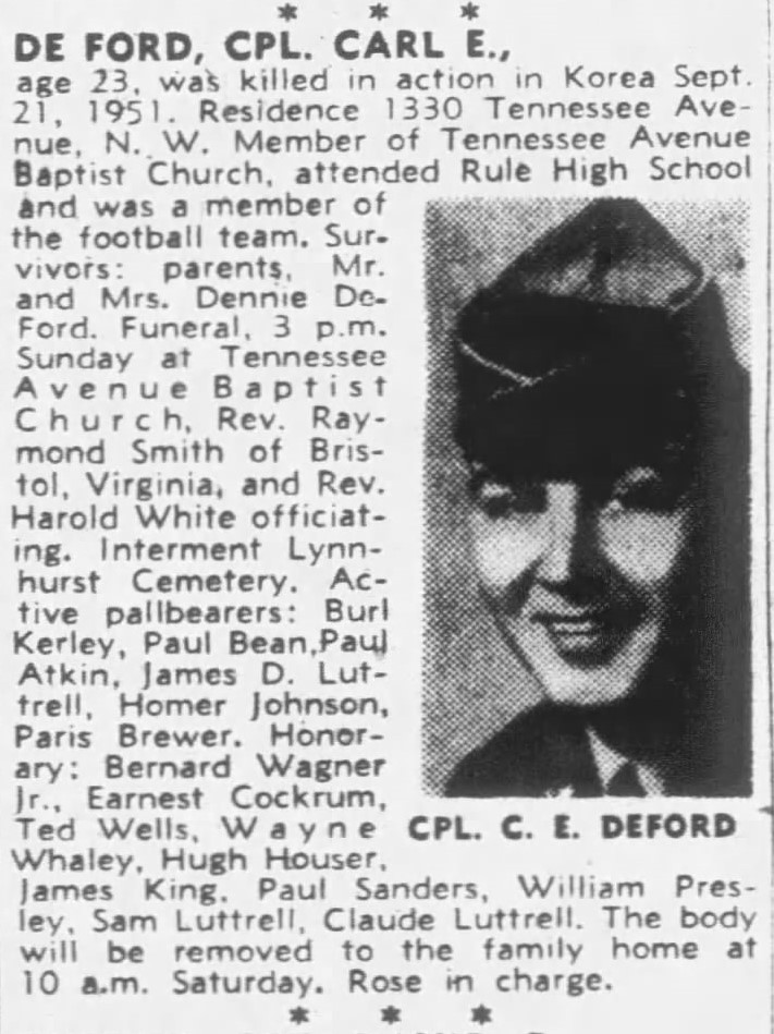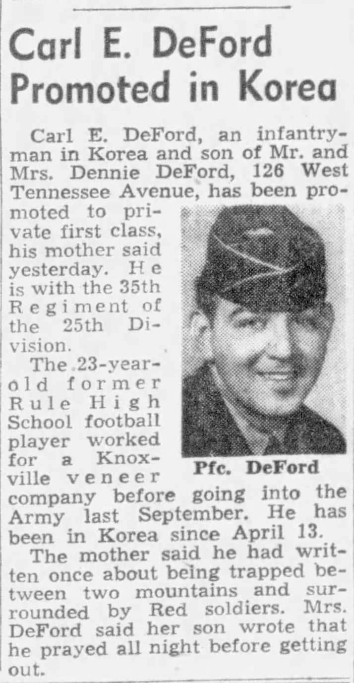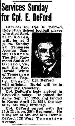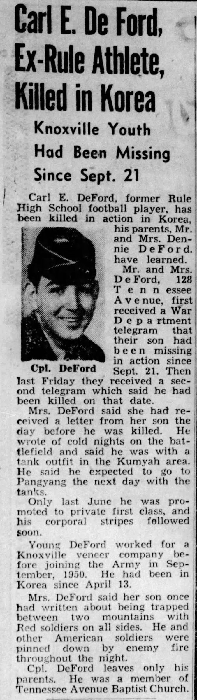 Carl E. DeFord, former Rule High School football player, has been killed in action in Korea, his parents, Mr. and Mrs. Dennie DeFord have learned. Mr. and Mrs. DeFord, 128 Tennessee Avenue, first received a War Department telegram that their son had been missing in action since Sept. 21. Then last Friday they received a second telegram which said he had been killed on that date. Mrs. DeFord said she had received a letter from her son the day before he was killed. He wrote of cold nights on the battlefield and said he was with a tank outfit in the Kumyah area. He said he expected to go to Pangyang the next day with the tanks. Only last June he was promoted to private first class, and his corporal stripes followed soon. Young DeFord worked for a Knoxville vencer company before joining the Army in September, 1950. He had been in Korea since April 13.