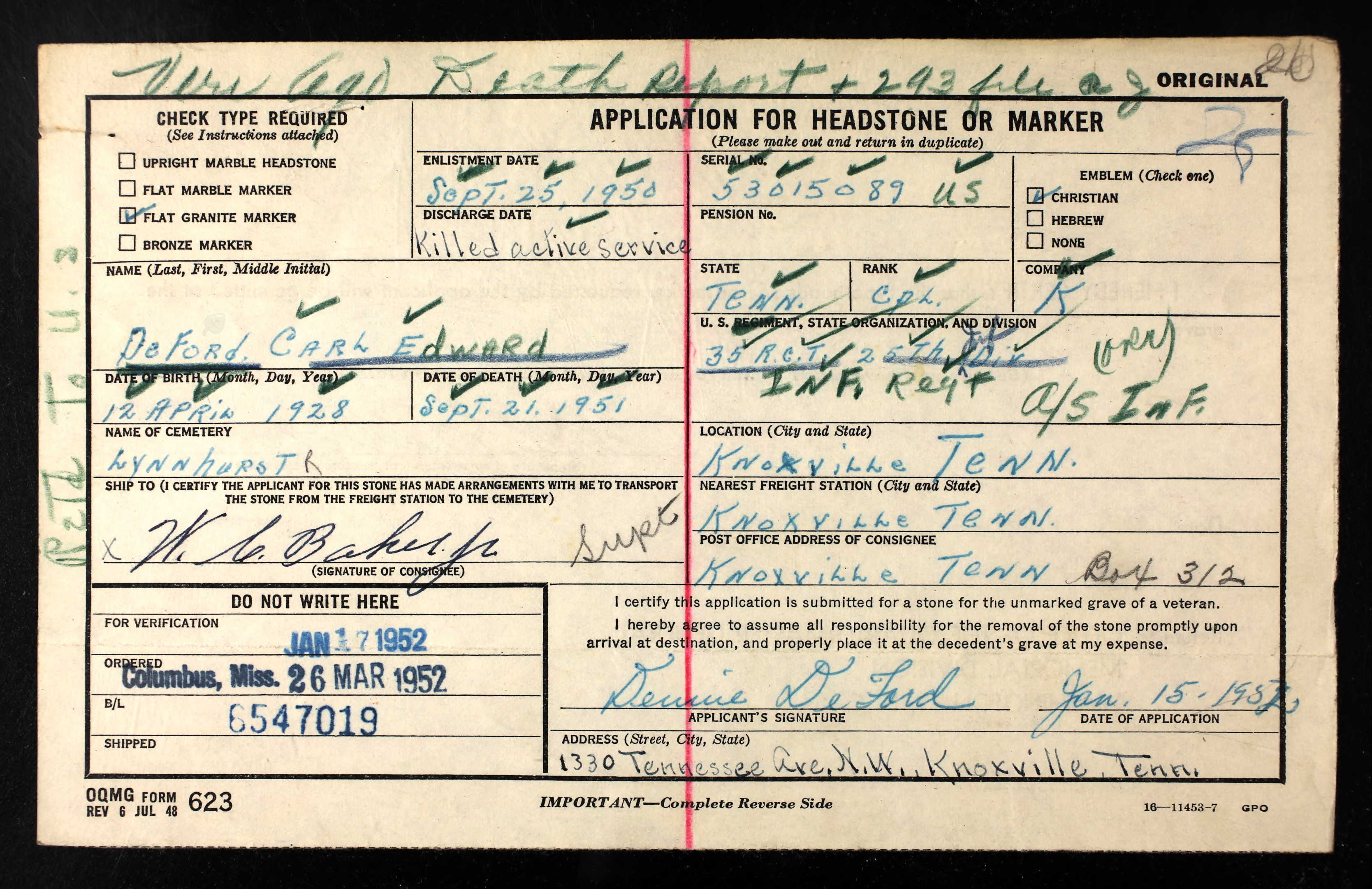 Corporal DeFord was involved with three major battles and was awarded battle stars for his actions. On September 21, 1951, he was in front of a patrol in the Kumwha area of North Korea. Kumwha was at the eastern tip of the Iron Triangle in central North Korea. The Iron Triangle was an area of heavy combat between the two forces and resulted in heavy losses. The triangle was defined between Kumwha to the east, Chorwon to the West, and Pyonggang at the Northern tip. While leading the patrol, Corporal DeFord discovered some wires at his forward position. He called back to his fellow comrades and told them to be on the alert. An explosion occurred seconds later and Corporal DeFord was killed by the blast. Corporal DeFord is believed to have set off a trip wire. As a result of his warning, the other members of his patrol were not injured. The men of his patrol were so moved by his sacrifice that they sent flowers and words of sympathy to the family at the time of his funeral. Corporal Carl DeFord was placed on the troop transport ship Loma Victory and returned to San Francisco, California just before Christmas 1951. He was transported from California to Knoxville arriving on the Southern Railway. Funeral Services were held Sunday, January 13, 1952, at Tennessee Avenue Baptist Church and he was laid to rest in Lynnhurst Cemetery, Knoxville.
