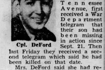 Mrs. DeFord said her son once had written about being trapped between two Mountains withh Red soldiers on all sides. He and other American soldiers were pinned down by enemy fire throughout the night. Cpl. De Ford leaves only his parents. He was a member of Tennessee Avenue Baptist Church.