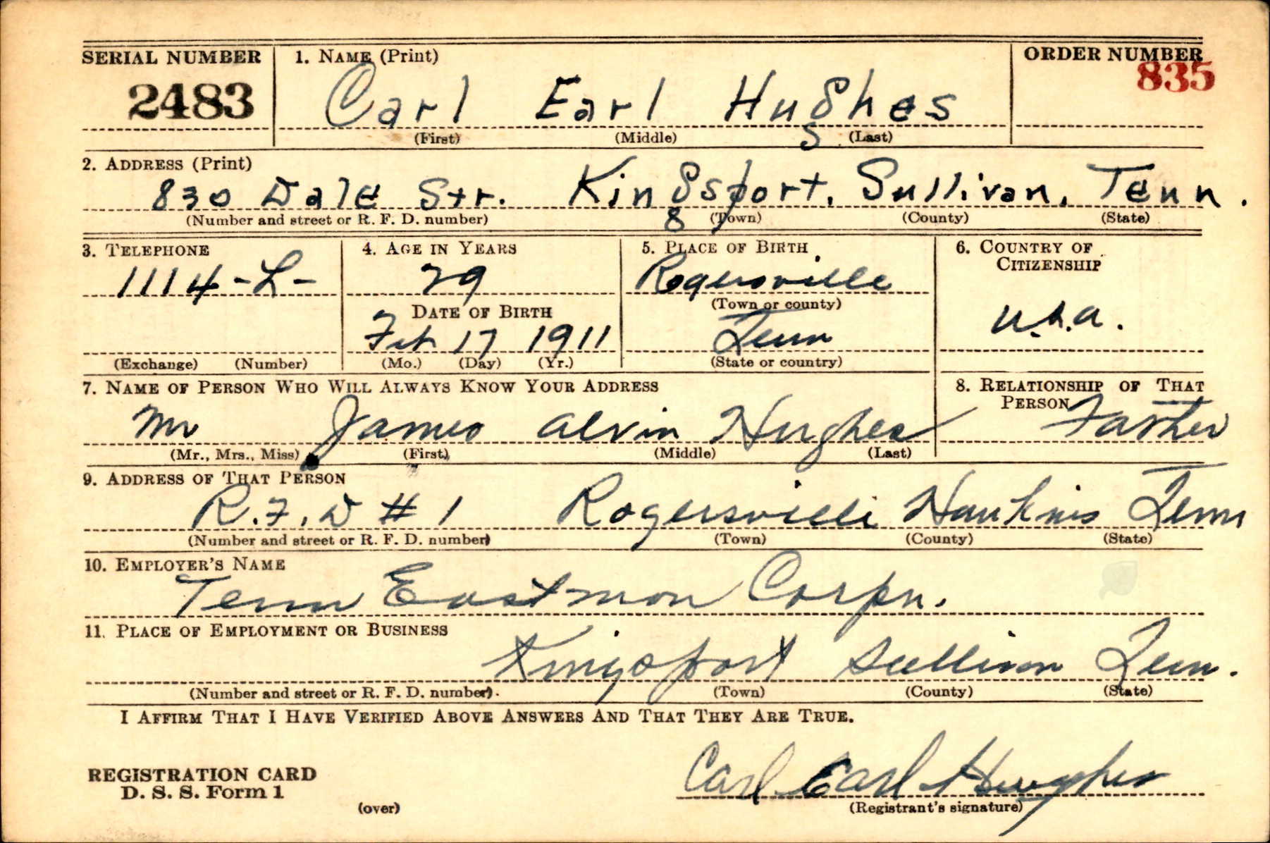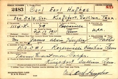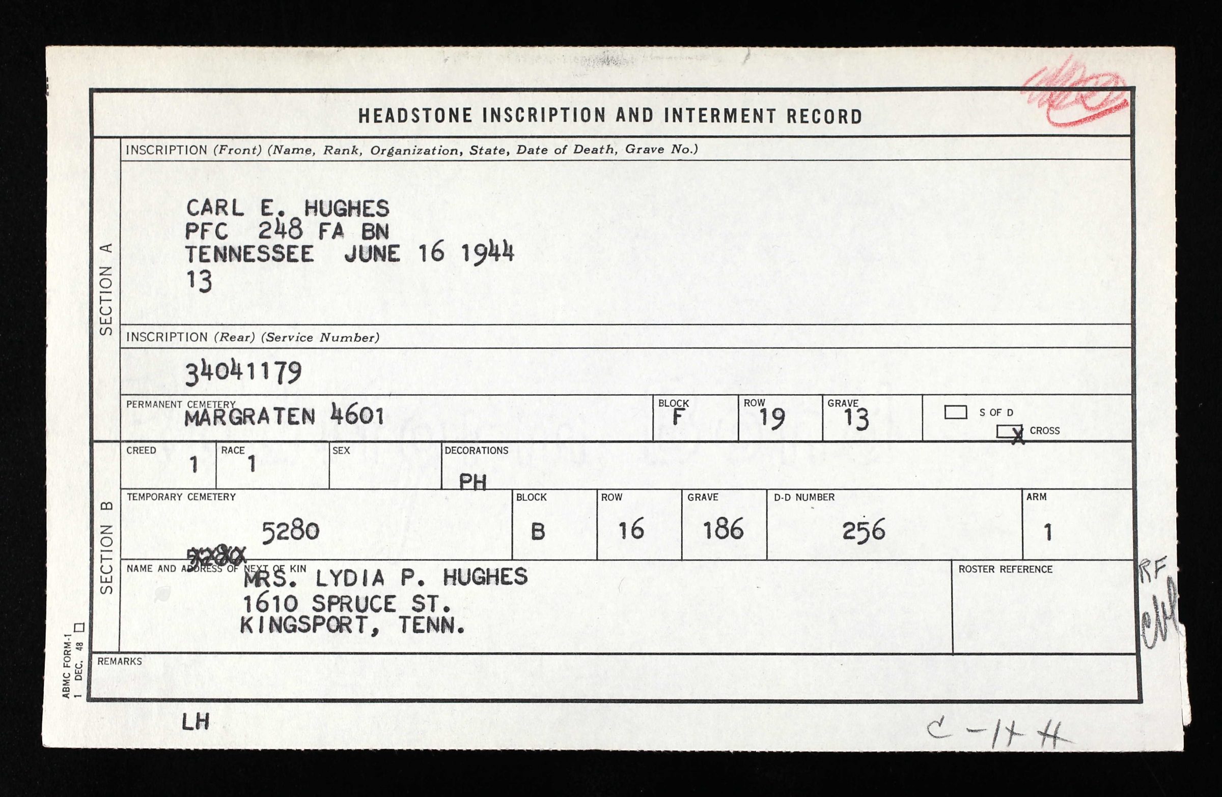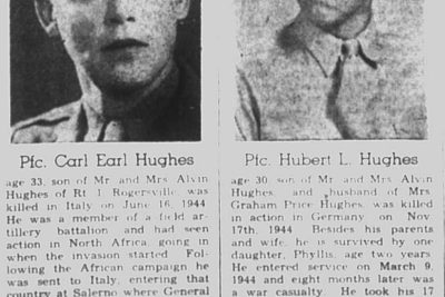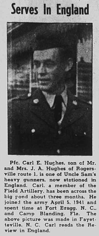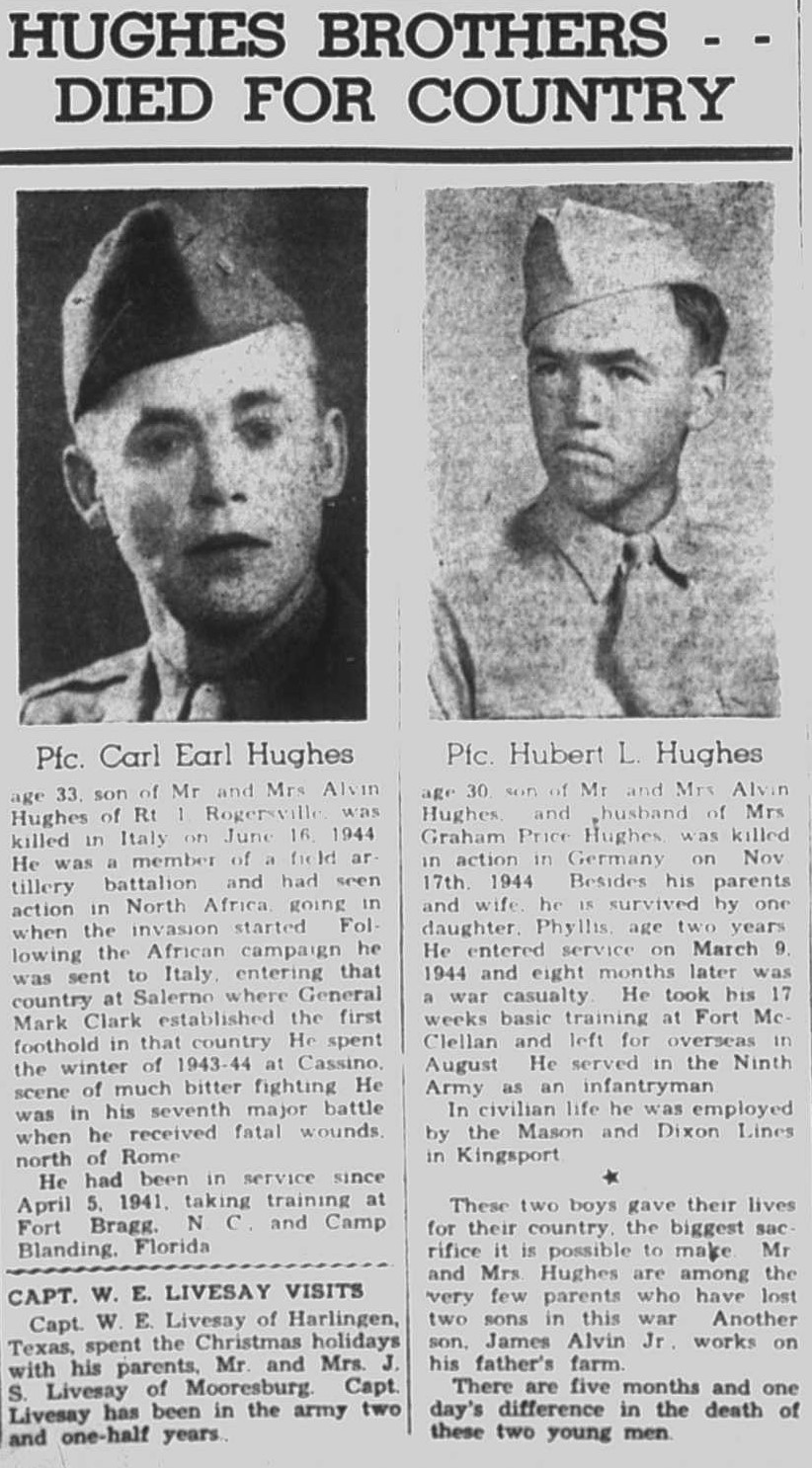 Pfc. Carl Earl Hughes, age 33, son of Mr. and Mrs. Alvin Hughes of Rt. 1, Rogersville, was killed in Italy on June 16, 1944. He was a member of a field artillery battalion and had seen action in North Africa going in when the invasion started. Following the African campaign he was sent to Italy, entering that country at Salerno, where General Mark Clark established the first foothold in that county. He spent the winter of 1943-1944 at Cassino scene of much bitter fighting. He was in his seventh major battle when he received fatal wounds north of Rome. He had been in service since April 5, 1941, taking training at Fort Bragg, N.C. and camp Blanding, Florida.