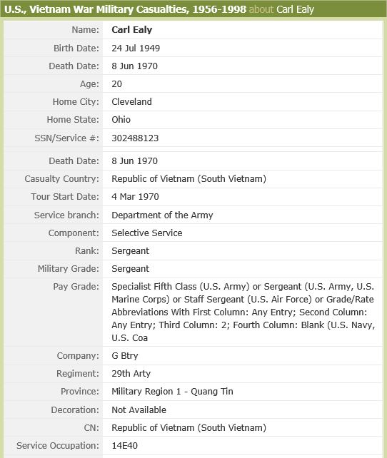 Sergeant Carl Ealy was born on July 24, 1949, and was originally from Cleveland, Ohio. He served his country in the Vietnam War in the United States Army, in G Battery, 29th Artillery, Americal Division. His tour in Vietnam began on March 4, 1970. Slightly over three months later, on June 8, 1970, Sgt. Ealy was killed under hostile conditions from artillery fire in Quang Tin province, South Vietnam; he was 20 years old at the time of his death. He was a recipient of the Purple Heart medal. Sgt. Ealy is buried at Union Cemetery in Newport, Tennessee, and is memorialized on the Vietnam Veterans Memorial on Panel 9W, Line 26.