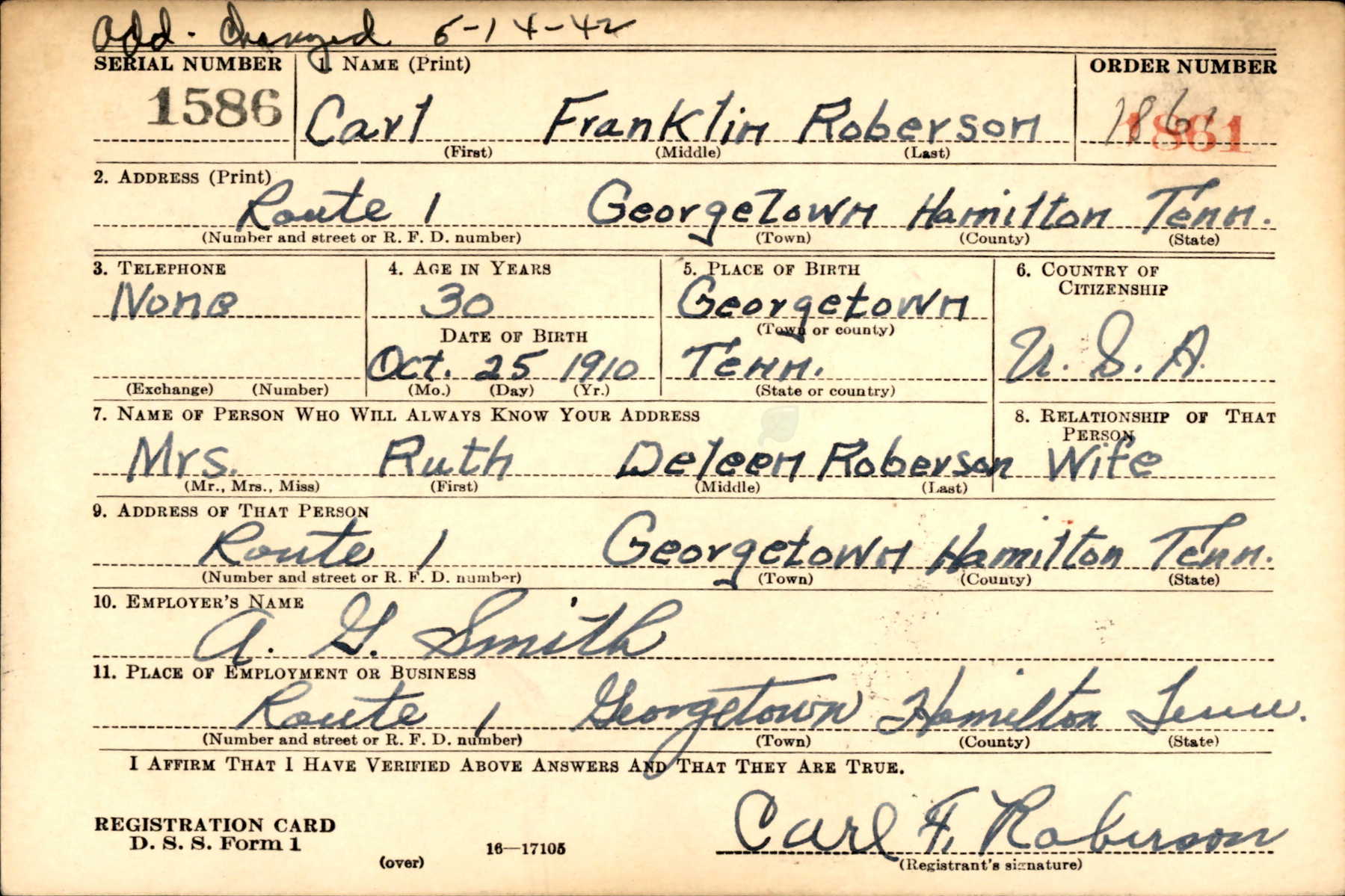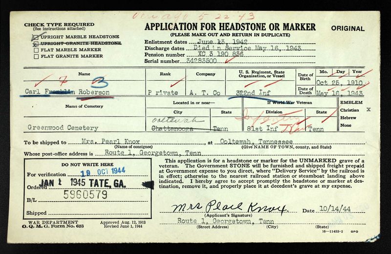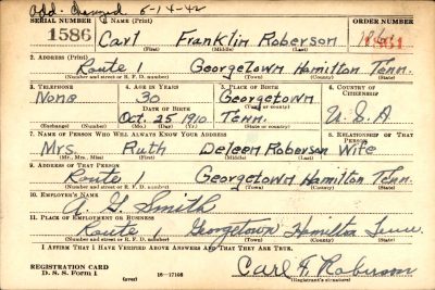 Carl Franklin Roberson was born on 25 October 1910 at Georgetown, Tennessee, the son of Reece and Ruth D. Roberson. Husband of Ruth Deleen Cartright but they filed for a divorce in February, 1943. He was the father of Franklin Lee Roberson who served in Korea.