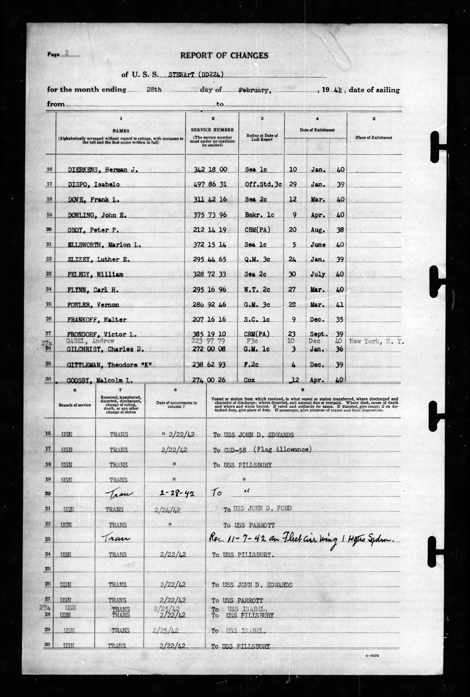 Carl Hines Flynn served on the U.S.S. Stewart (DD224) and was transferred to the U.S.S. Pillsbury on 22 February 1942. He was officially declared dead on 25 November 1945 and is memorialized at Manila American Cemetery.