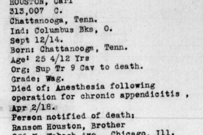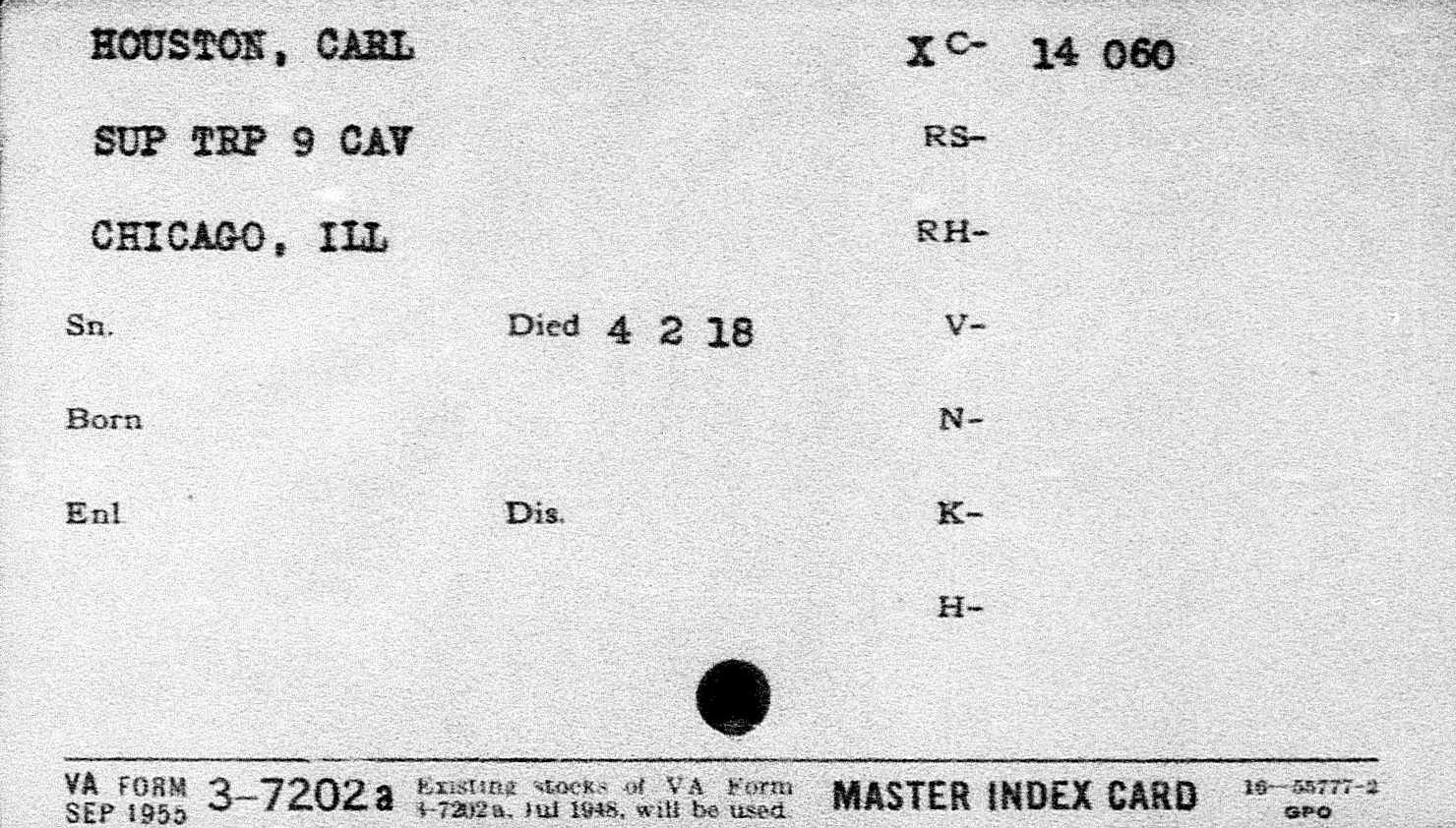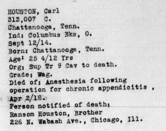 Carl Houston was born in 1895 in Chattanooga, Tennessee to General Houston and Louisa Tipton. He died of anesthesia following operation for chronic appendicitis.