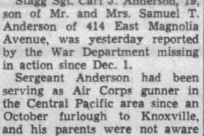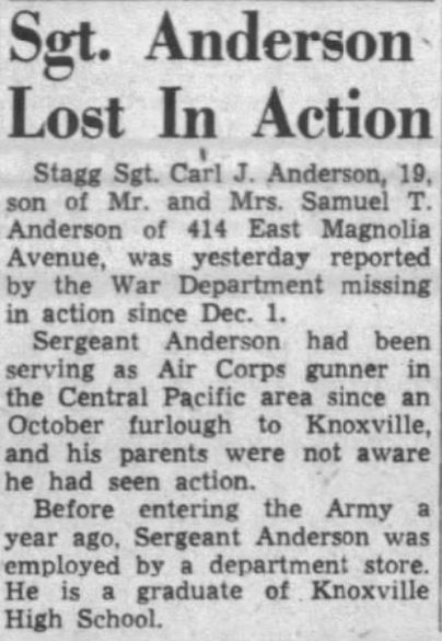 Sergeant Anderson had been serving as Air Corps gunner in the Central Pacific area since an October furlough to Knoxville, and his parents were not aware he had seen action. Before entering the Army a year ago, Sergeant Anderson was employed by a department store. He is a graduate of Knoxville High School.