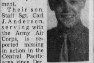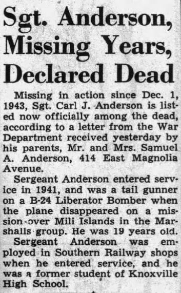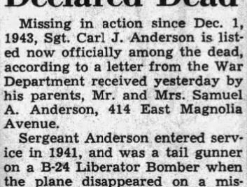 Missing in action since Dec. 1, 1943, Sgt. Carl J. Anderson is listed now officially among the dead, according to a letter from the War Department received yesterday by his parents. Sergeant Anderson entered the service in 1941, and was a tail gunner on a B-24 Liberator bomber when the plane disappeared on a mission over Mili Islands in the Marshall group. He was 19 years old.