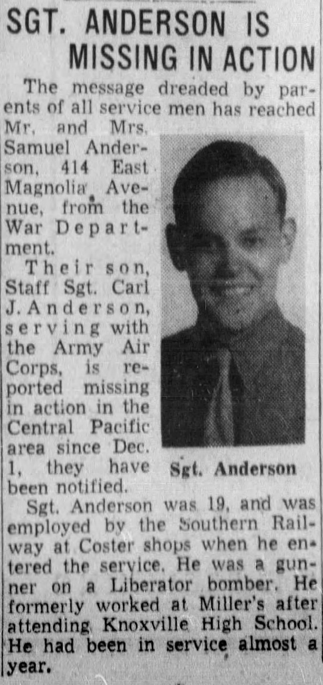 Staff Sgt. Carl J. Anderson, 19, son of Mr. and Mrs. Samuel T. Anderson of 414 East Magnolia Avenue, was yesterday reported by the War Department missing in action since Dec. 1.