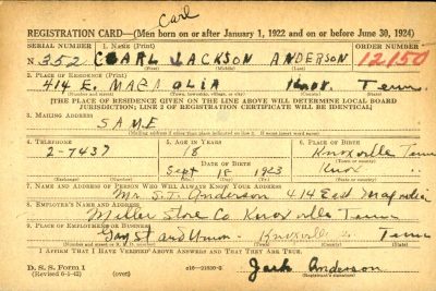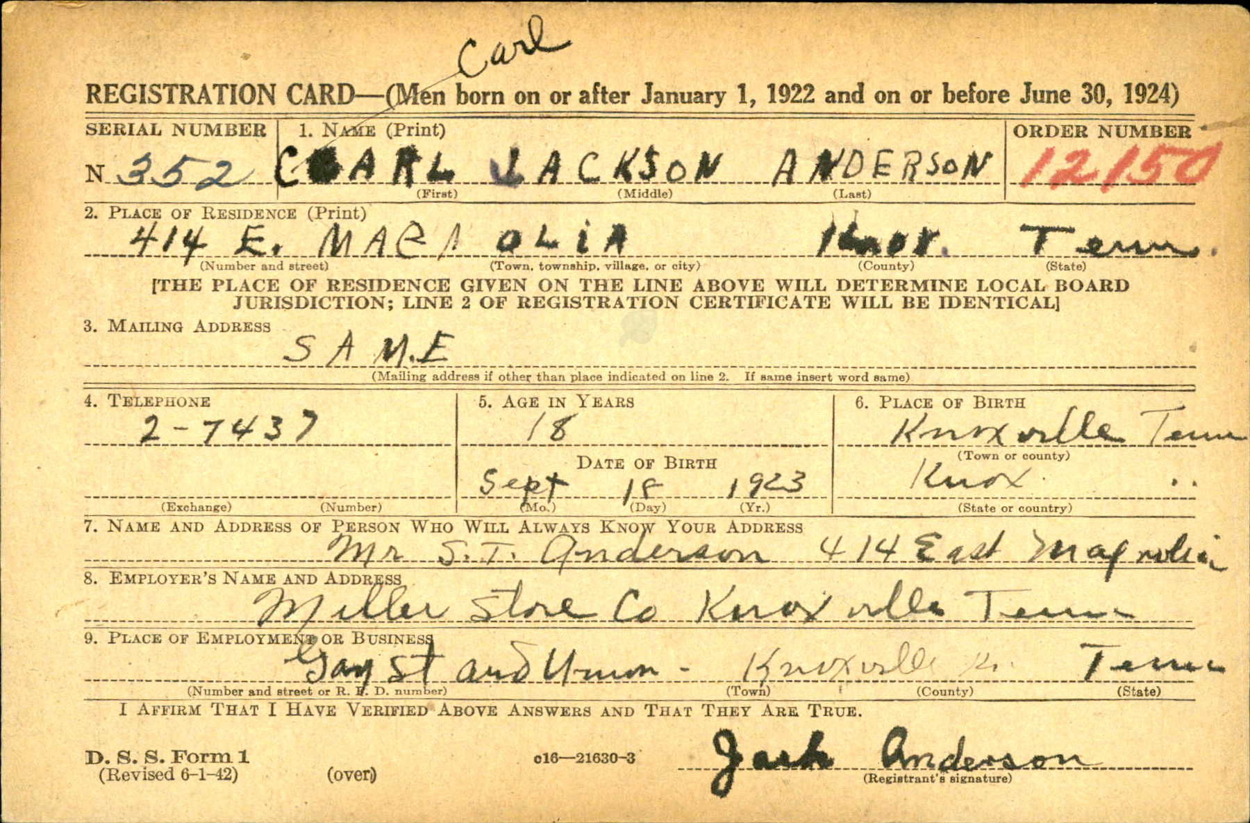 Carl Jackson Anderson was born in Knoxville, Tennessee, the son of Samuel Thomas Anderson and Dorcas “Dorothy” Ann Tindell.