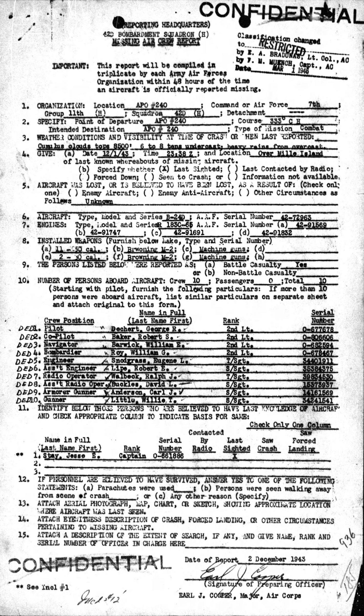 The last time I saw Lt. Bechert’s airplane, #42-72963, he followed me directly over the target in formation. We peeled off to make individual runs and to get a better view of the target. The conditions were semi-instrument so lost track of him. As we came back towards the target we saw Lt. Dechert on his bombing run. That was the last time I saw him. We circled the target, made our run and peeled down into the clouds. We had seen no Zeros in the air until we were on our last run. As we cleared the target we were attacked by five Zeros. We saw no Zeros attacking Lt Dechert as he made his run. Static interference on the Command Frequency was strong enough to make reception practically impossible.