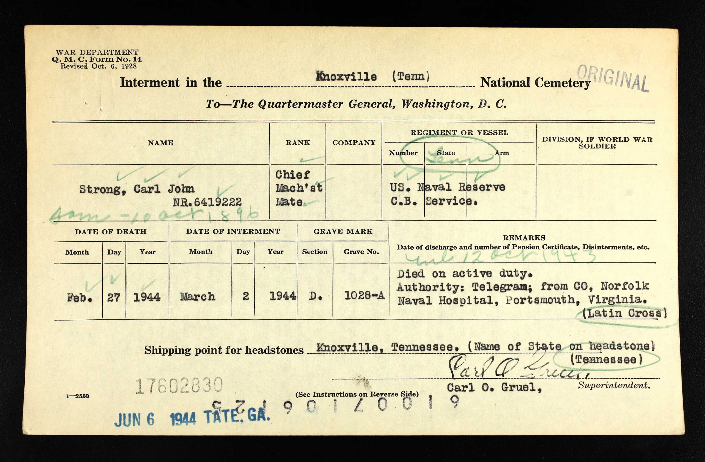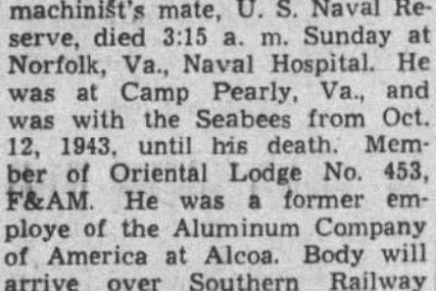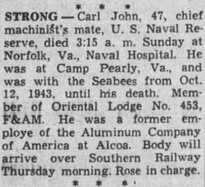 Strong, Carl John- 47, Chief Machinist’s Mate, U.S. Naval Reserve, died 3:15 a.m. Sunday at Norfolk, Virginia, Naval Hospital. He was at Camp Perry, Virginia, and was with the Seebees from October 12, 1943 until his death. Member of Oriental Lodge No 453, F & A.M. He was a former employee of the Aluminum Company of America at Alcoa. Body arrived over the Southern Railway 6:30 a.m. today. Funeral 3 p.m. Thursday at Rose Chapel, Rev. Steven Grigsby officiating. Interment in National Cemetery. –Knoxville News-Sentinel, March 2, 1944