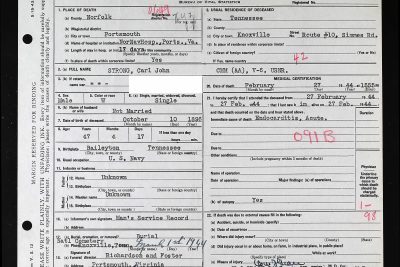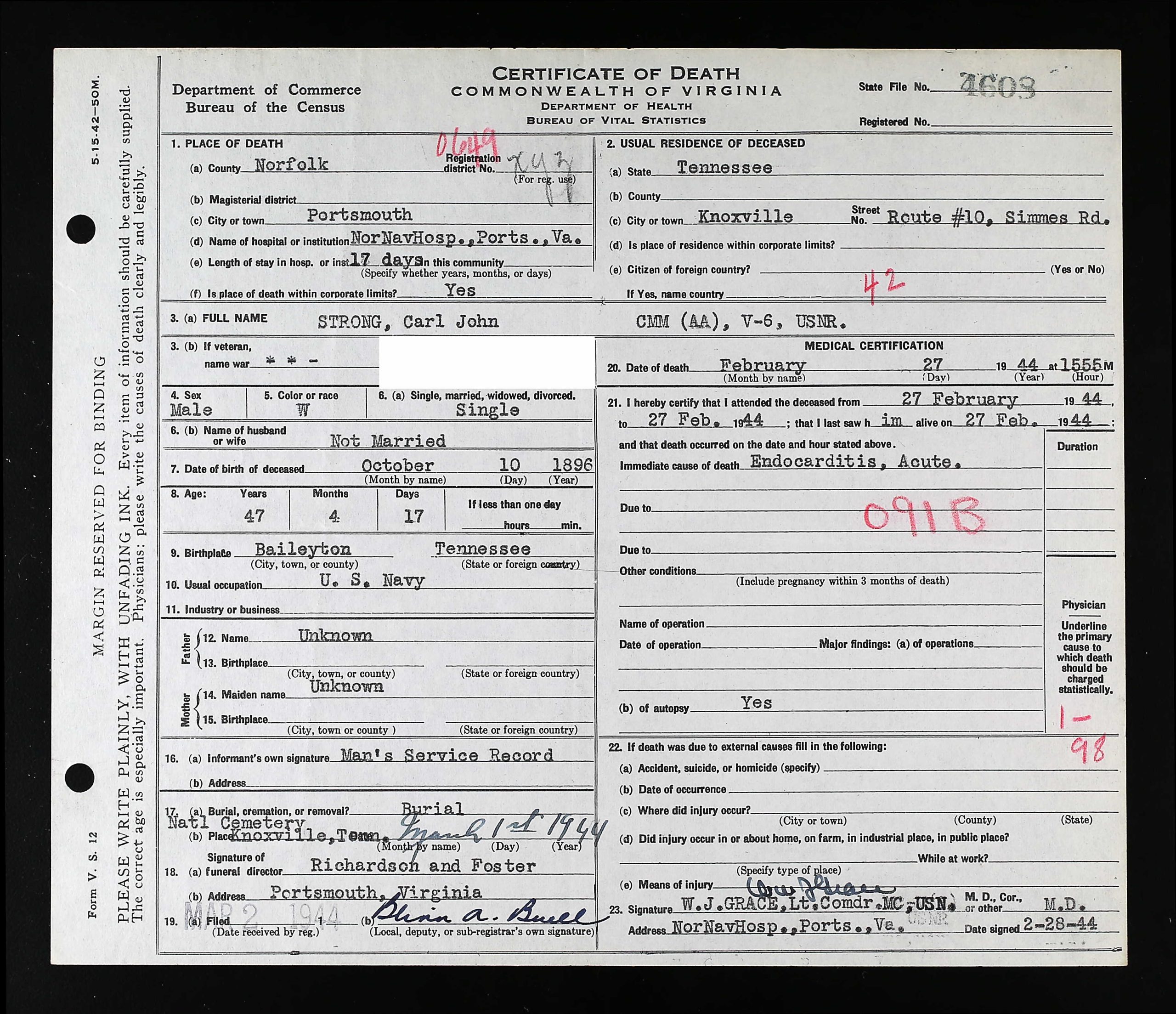 Strong, Carl John- 47, Chief Machinist’s Mate, U.S. Naval Reserve Knoxville address 257 Sims Road died of pneumonia 3:15 p.m. February 27th at Norfolk Naval Hospital, Portsmouth, Va. He was formerly employed at the Aluminum Company , Alcoa. Burial in National Cemetery, Knoxville. Funeral arrangements later. – The Knoxville News Sentinel, February 28, 1944