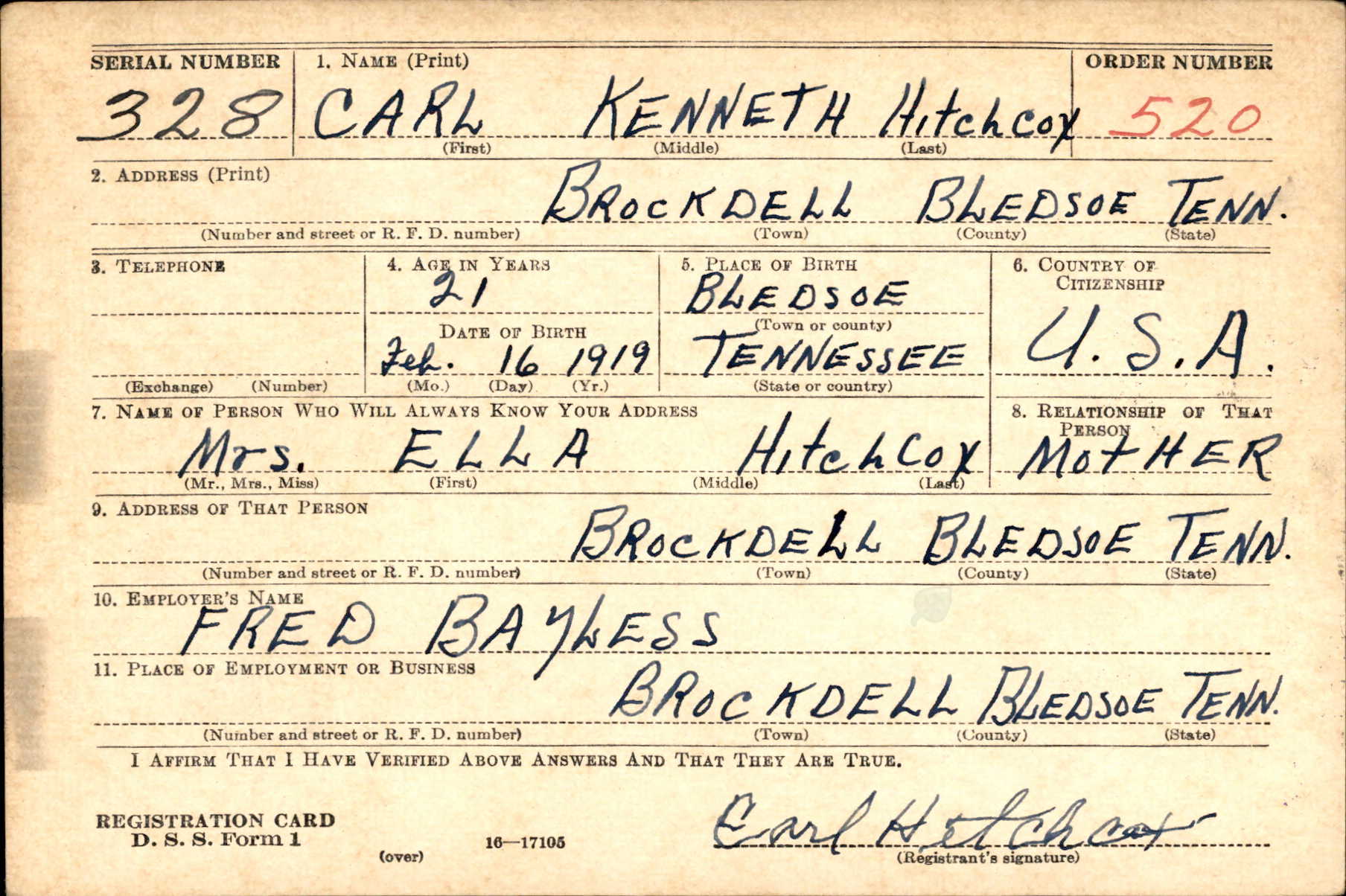 Carl Kenneth HitchcoxBorn 16 February 1919, the son of Ella Hitchcox
