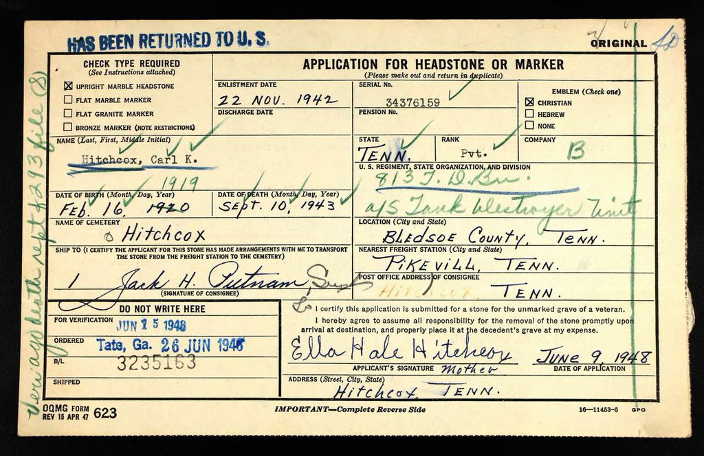 - Burial/Memorial Location: Hitchcox Cemetery, Bledsoe County, TN