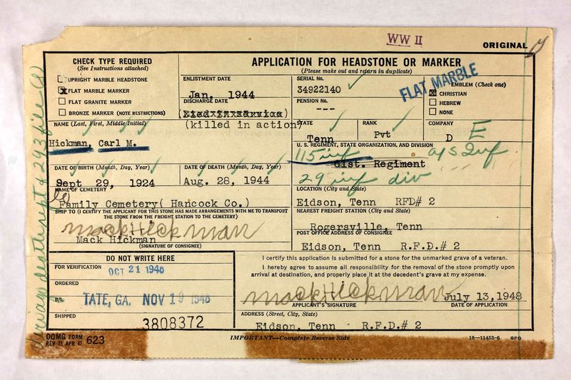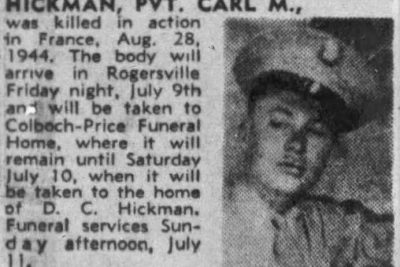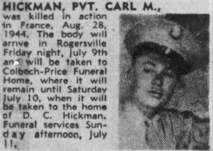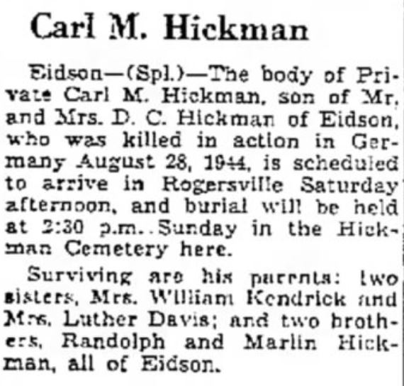 Eidson – The body of Private Carl M. Hickman, son of Mr. and Mrs. D.C. Hickman of Eidson, who was killed in action in Germany, August 28, 1944, is scheduled to arrive in Rogersville Saturday afternoon, and burial will be held at 2:30 p.m. Sunday in the Hickman Cemetery here.
