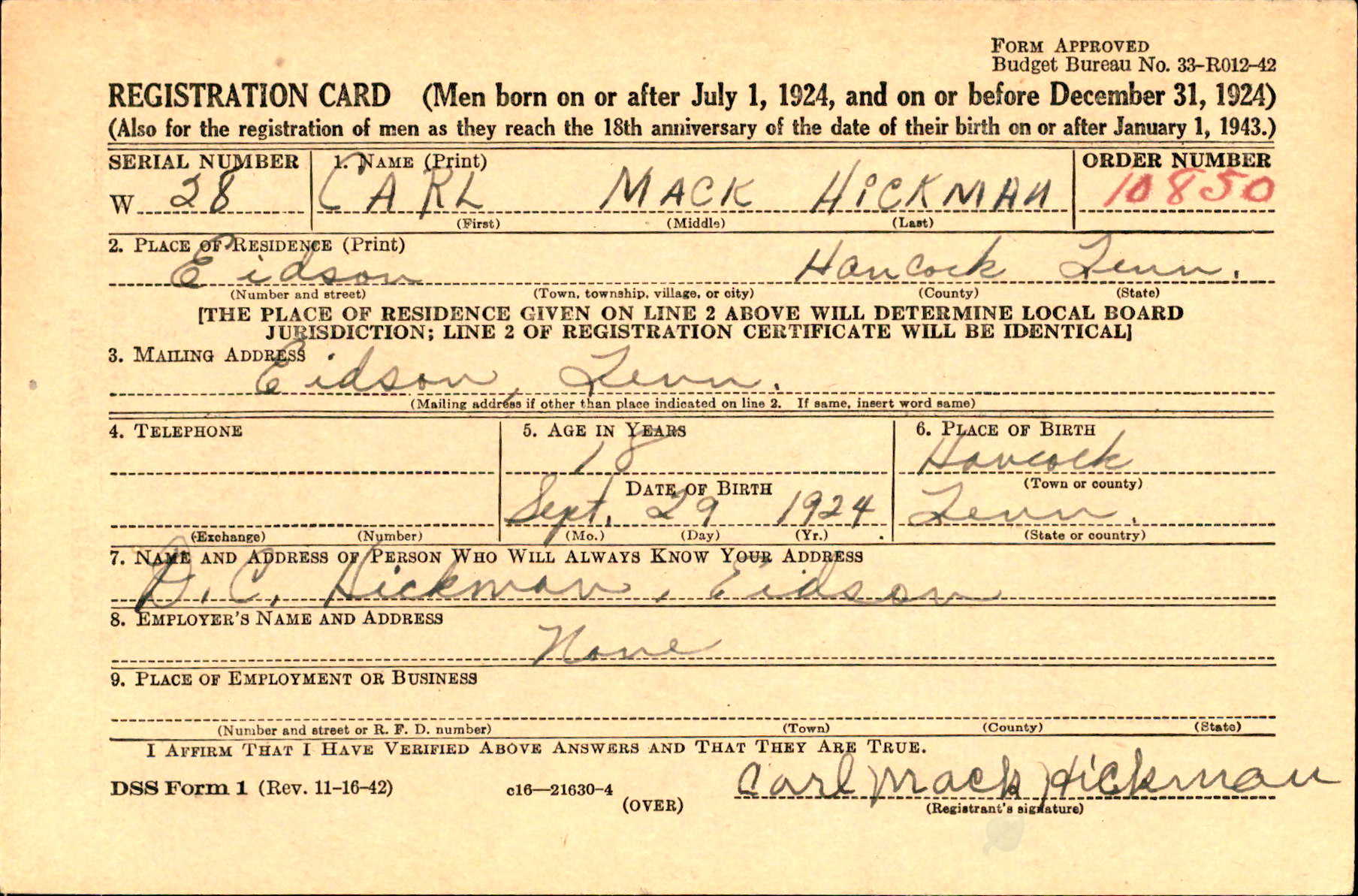 Carl Mack Hickman was born on 29 September 1924, son of David Carmack Hickman and Matilda Dillion.