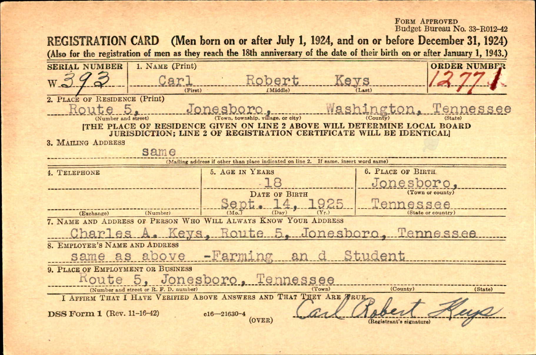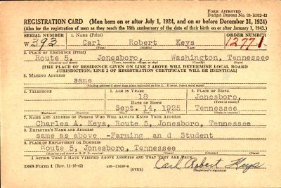 Carl Robert Keys was born on 14 September 1925 at Jonesborough, Tennessee, the son of Charles Alexander Keys and Anna Ruth Susong.