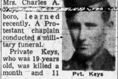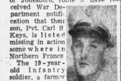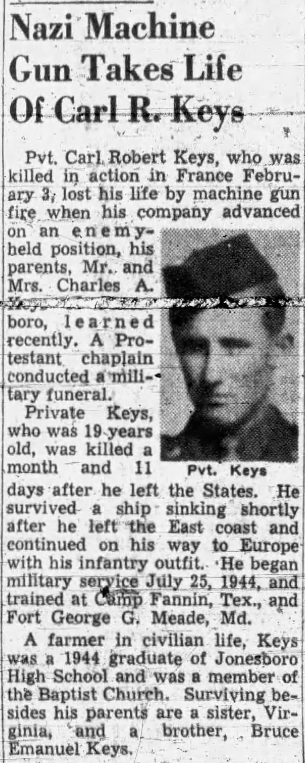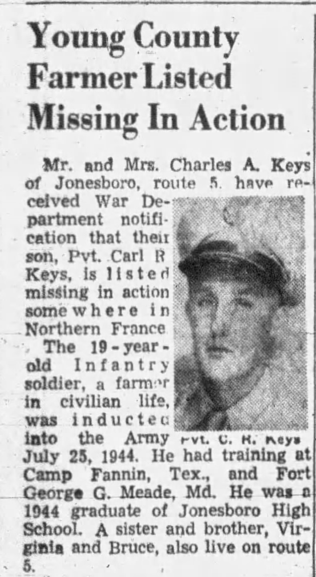 Mr. and Mrs. Charles A. Keys of Jonesboro, route 5, have received War Department notification that their son, Pvt. Carl R. Keys, is listed missing in action somewhere in Northern France. The 19-year-old infantry soldier, a farmer in civilian life, was inducted into the Army July 25, 1944. He had trained at Camp Fannin, Tex., and Fort George G. Meade, Md. He was a 1944 graduate of Jonesboro High School. A sister and brothers, Virginia and Bruce, also live on route 5.