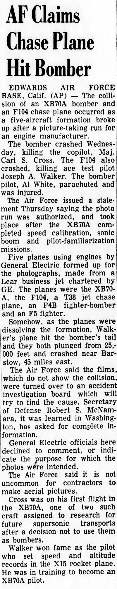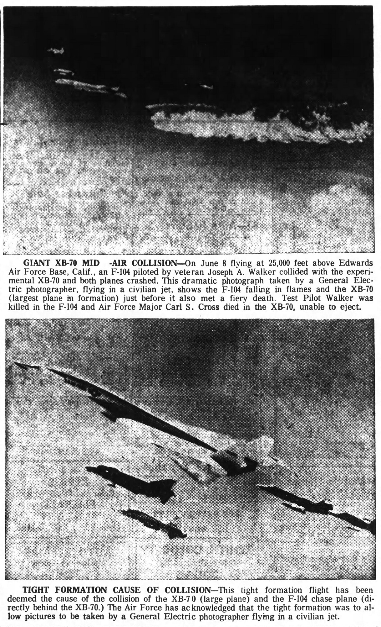 Major Carl Cross made the ultimate sacrifice in the pursuit of aviation conquests. Not only did this tragedy cost the country two fine test pilots but it doomed the XB-70 test program and any further unimaginable progress that it might have made in aviation. All this tragedy was for some photos to be taken and used in an advertisement.