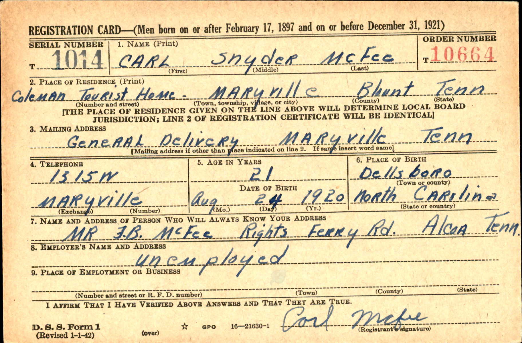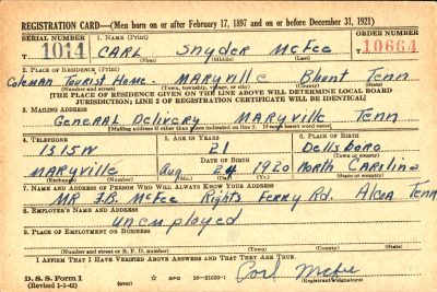 Carl Snyder McFee is memorialized at Manila American Cemetery in the Philippines and at Clarks Grove Cemetery, Maryville, Blount County, TN