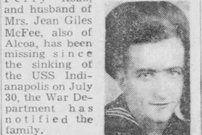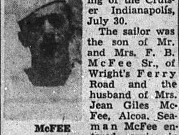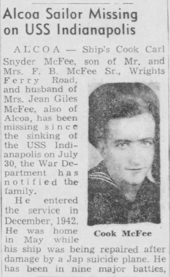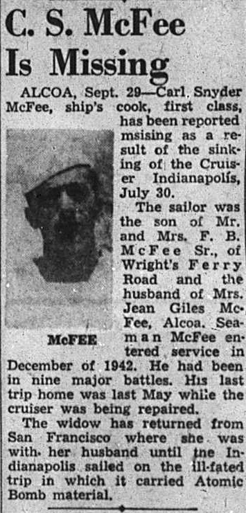 Alcoa, Sept. 29 – Carl Snyder McFee, ship’s cook, first class has been reported missing as a result of the sinking of the cruiser Indianapolis, July 30. The sailor was the son of Mr. and Mrs. F.B. McFee Sr., of Wright’s Ferry Road and the husband of Mrs. Jean Giles McFee, Alcoa. Seaman McFee entered service in December of 1942. He had been in nine major battles. His last trip home was last May while the cruiser was being repaired.
