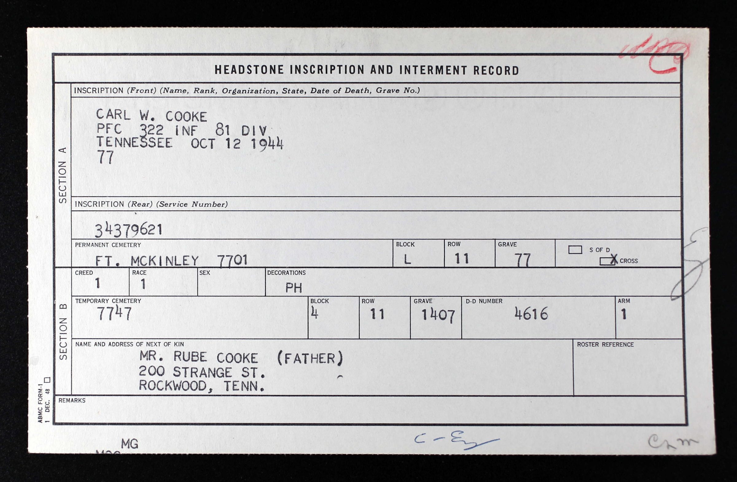 PFC Cooke was killed in action 12 October 1944. He was later interred at the Manila American Cemetery, Phillippines, at l,11,77.