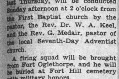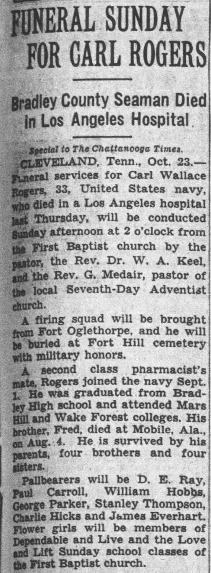 Funeral services for Carl Wallace Rogers, 33, United States navy, who died in a Los Angeles hospital last Thursday, will be conducted from the First Baptist Church. A firing squad will be brought from Fort Oglethorpe, and he will be buried at Fort Hill Cemetery with military honors. A second class pharmacist’s mate, Rogers joined the navy Sept. 1. He was graduated from Bradley High School and attended Mars Hill and Wake Forrest Colleges. His brother, Fred, died at Mobile, Ala., on Aug. 4. He is survived by his parents, four brothers and four sisters.